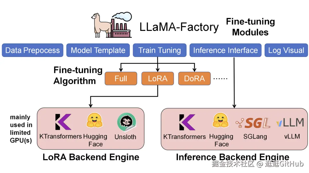 KT-SFT 模块: 则解决了大模型微调的资源瓶颈问题。通过与 LLaMA-Factory 的深度集成,只需 70GB GPU 内存和 1.3TB RAM 即可对 671B 参数的 DeepSeek-V3 模型进行 LoRA 微调,这在传统框架中是不可想象的。