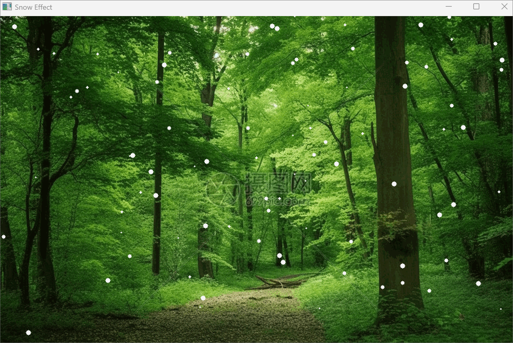 先来看一下最终效果:程序可以为静态图片、视频或摄像头实时画面添加动态飘落的雪花,雪花具有随机的大小、下落速度和水平飘动效果,当雪花超出画面范围后会自动从顶部重新生成,形成持续的下雪动画。