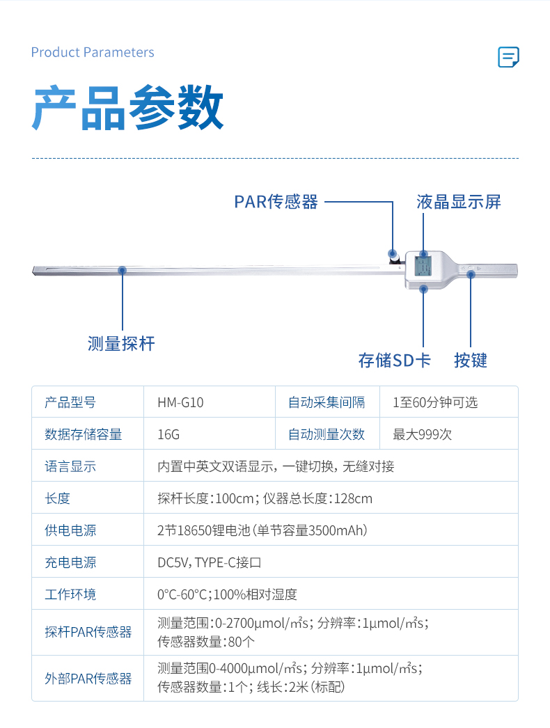 线性传感器阵列型仪器,通过多个传感器同时测量不同位置的光合有效辐射,计算冠层透光率。这类仪器通常由探杆、传感器和数据显示器组成,探杆长度约50厘米,配备25个传感器,能够测量0-2700μmol㎡/秒范围内的光合有效辐射。
