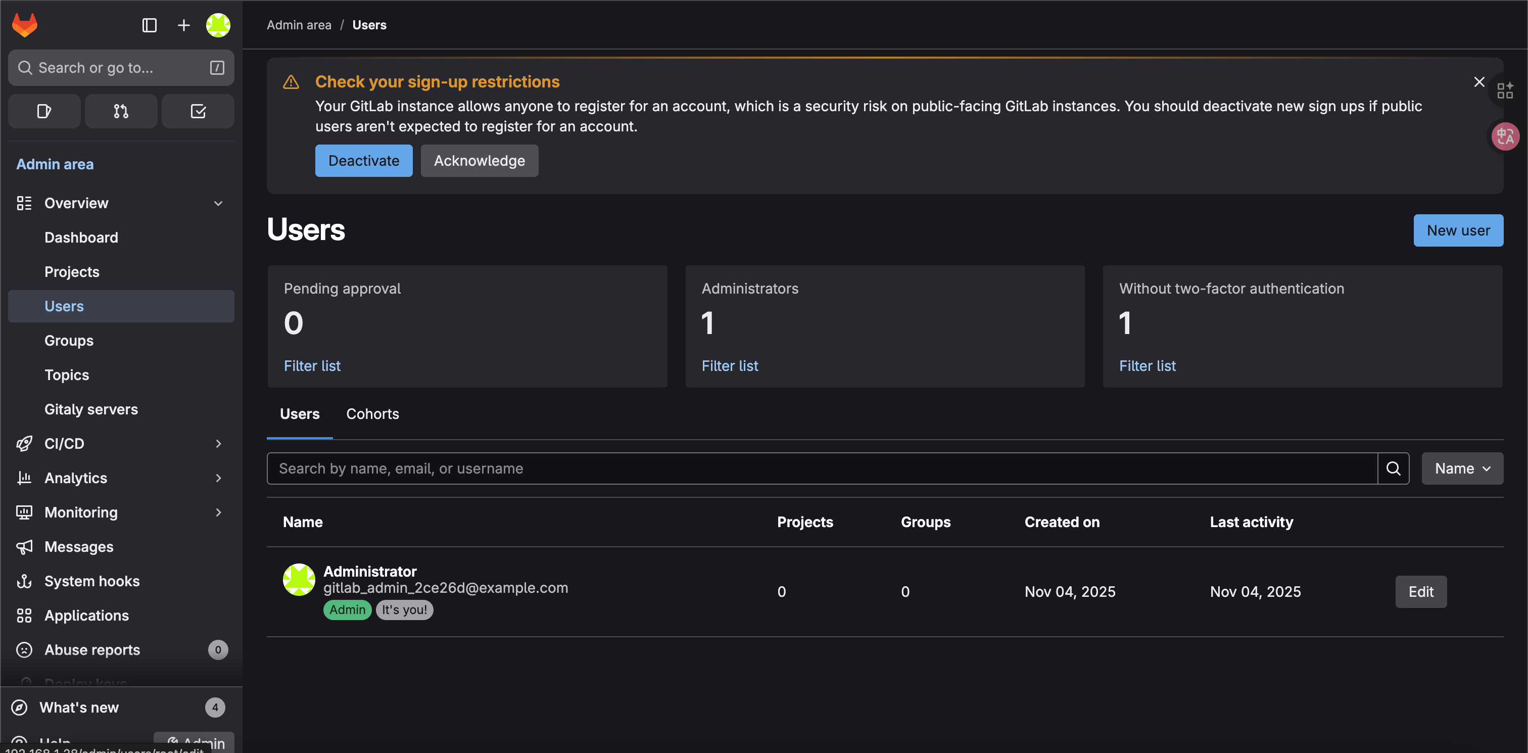 sudo docker exec -it gitlab grep 'Password:' /etc/gitlab/initial_root_password