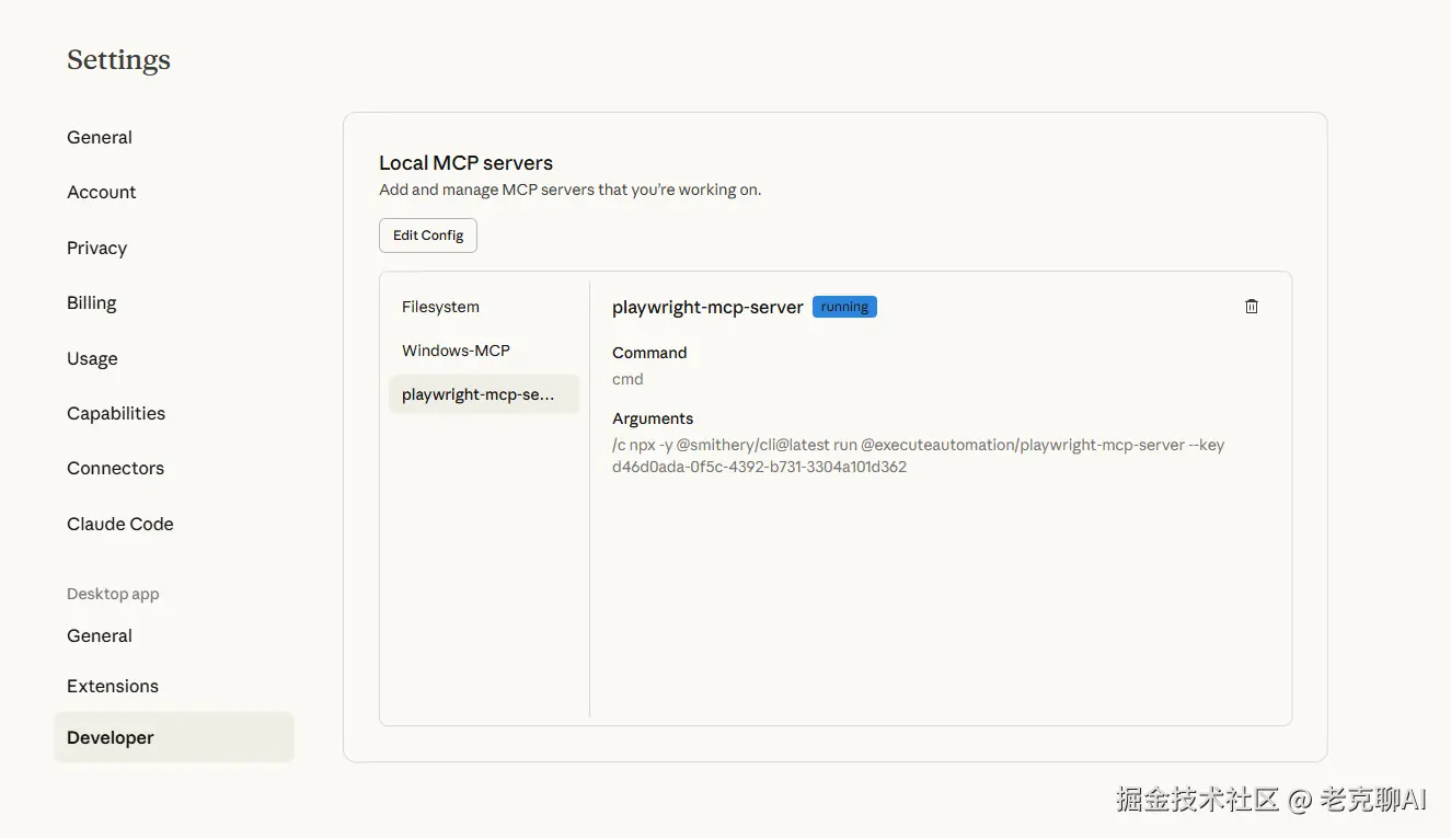 安装完成后打开Claude Desktop客户端,在Settings→Developer中可以看到已经安装的Playwright MCP。