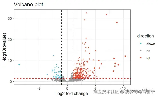 红色表示上调基因(P<0.05, Fold change >=2),蓝色表示下调基因,灰色表示不显著的基因(即要么Fold change不满足阈值,要么Pvalue不满足阈值,要么Fold change和Pvalue都不满足阈值),两条垂直虚线表示Fold change(这里默认2倍,即log2(2)=1),一条水平线表示Pvalue阈值(默认0.05)