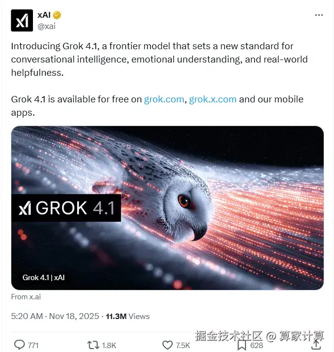 今天凌晨,马斯克旗下xAI正式发布了Grok 4.1模型。该版本现已向所有用户开放,免费用户也能在Grok官网、X平台及iOS和Android应用中体验到。
