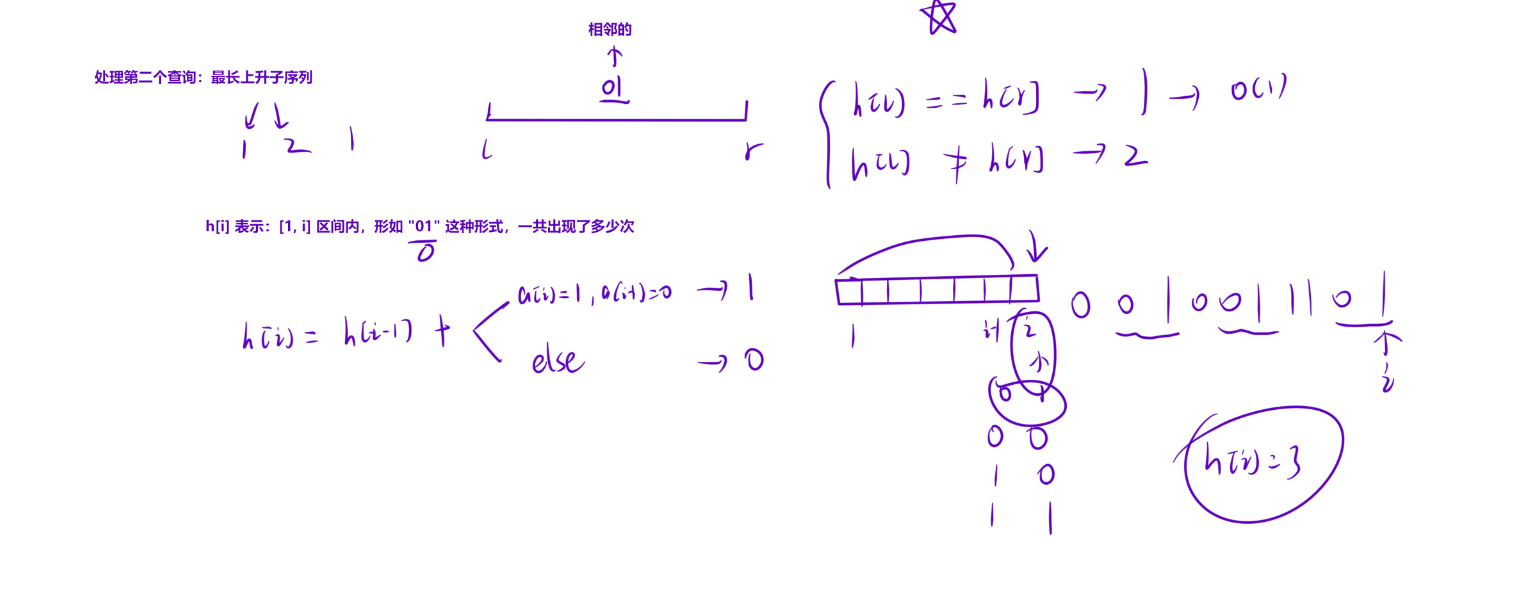 我们可以预处理出一个数组:h[x]:表示:[1,i] 区间内,形如 "01" 这种形式出现了多少次。