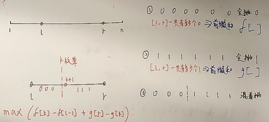 我们枚举分割点,然后结合上面的两个前缀和数组,就可以算出最长的长度。