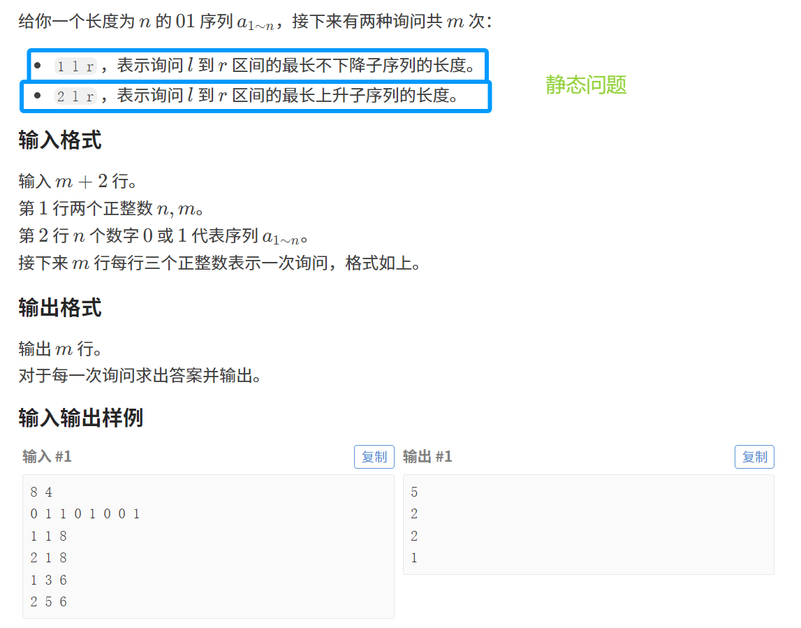 我们发现直接维护最长不下降子序列的长度信息的是比较困难的,线段树、树状数组、ST表都不能解决。