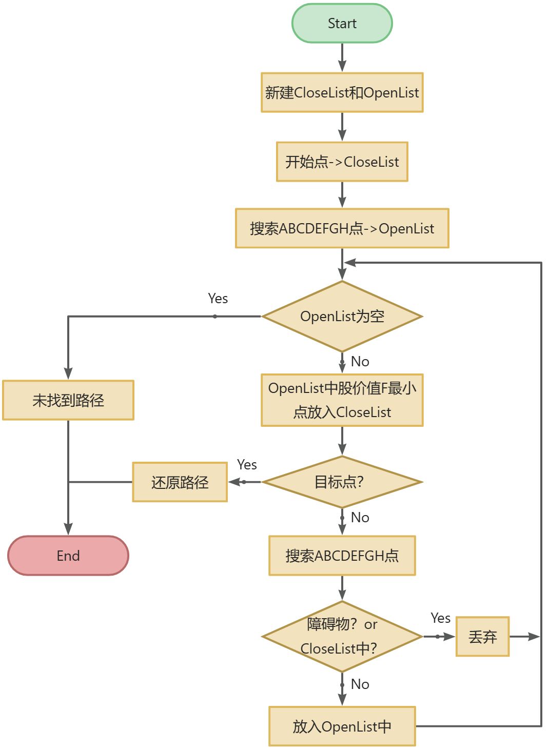 1)新建两个点集合CloseList和OpenList,CloseList用于存放搜索过的点,OpenList用于存放待向目标点搜索的点;