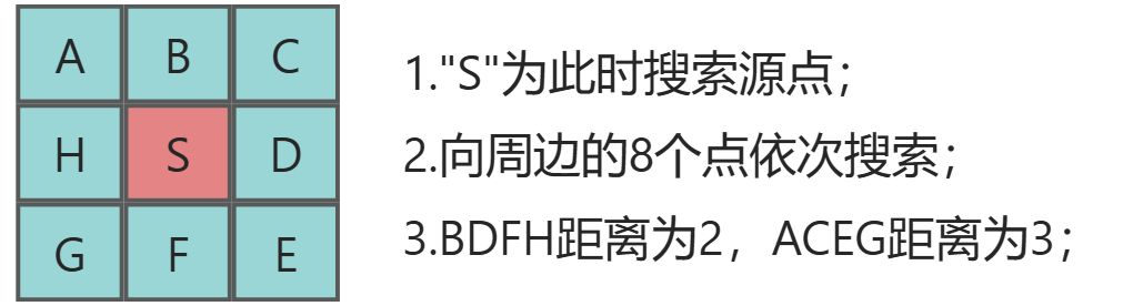 A*算法和Dijkstra算法类似,只是在其基础上叠加一个"到终点的估算距离",于是搜索方向被强行拉向目标点,速度通常快得多。本节演示的是非网络的搜索示例,搜索的边长为2,斜对角线为3,如下图所示: