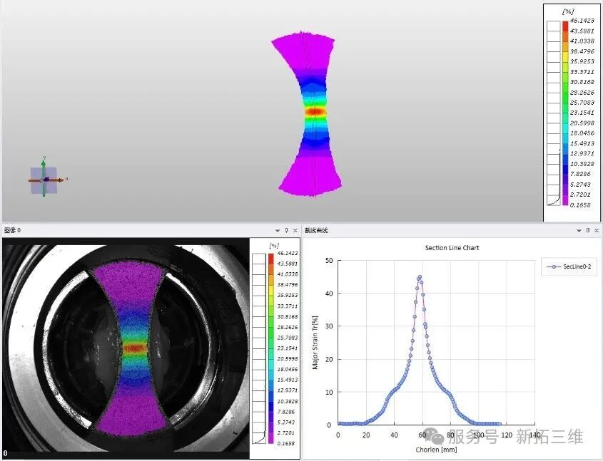 采集数据完毕后,XTDIC三维全场应变测量系统搭配的DIC软件自动生成三维变形云图,包括破裂临界时的形貌和离面位移场、主应变场。DIC软件中选择"截线拾取",可画取垂直于裂缝的截线,并绘制相应曲线,确定板料成型过程的极限。