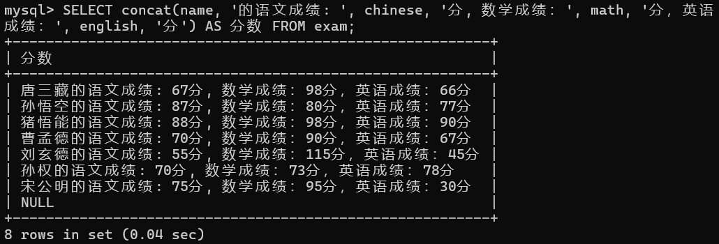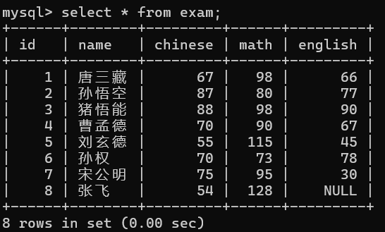 SELECT * FROM exam WHERE english < 50; # null值在排序时比任何值都小,但是在where条件中null也会被过滤掉