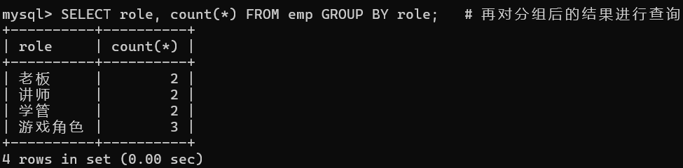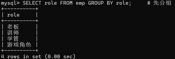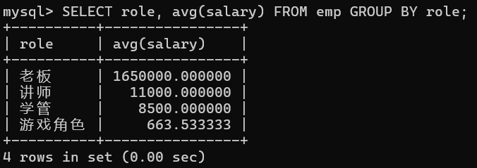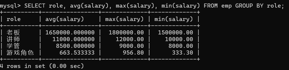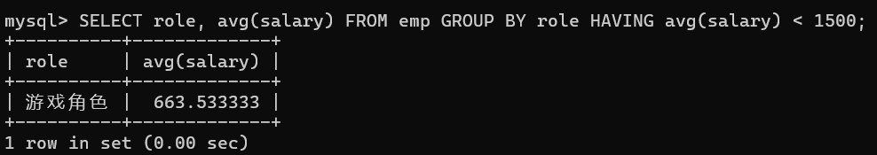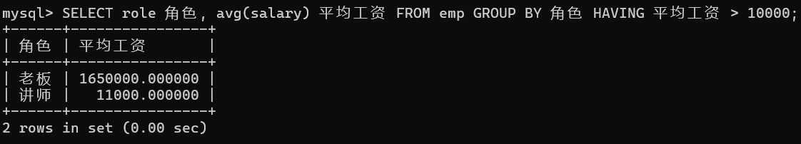 SELECT role 角色, avg(salary) 平均工资 FROM emp GROUP BY 角色 HAVING 平均工资 > 10000;