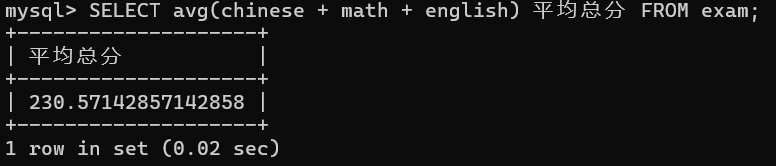 SELECT avg(chinese + math + english) 平均总分 FROM exam;