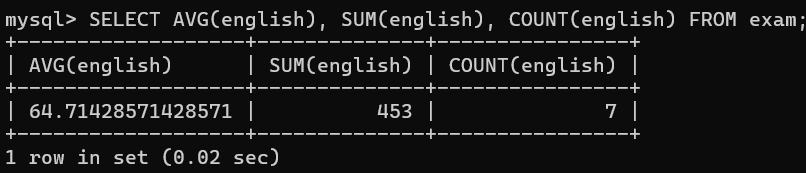 SELECT AVG(english), SUM(english), COUNT(english) FROM exam;