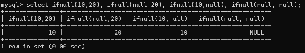 | ifnull(val1, val2) | 如果val1为NULL,返回val2,否则返回val1 |