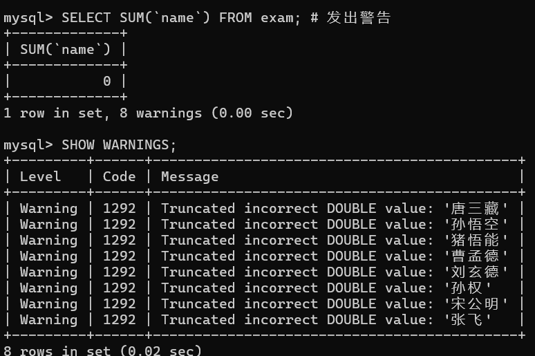 SELECT SUM(`name`) FROM exam; # 发出警告