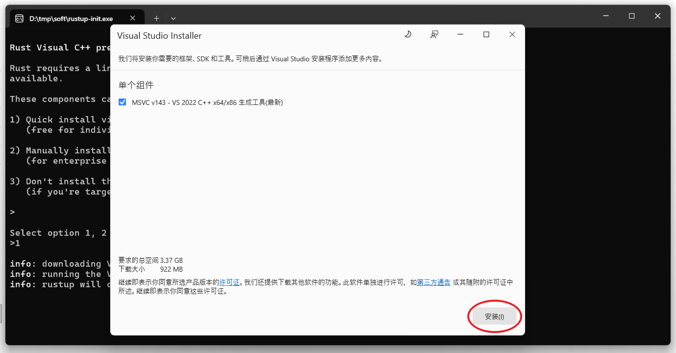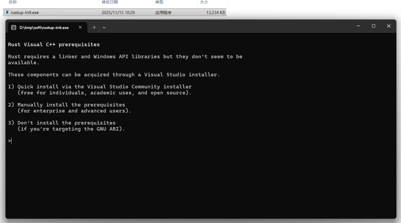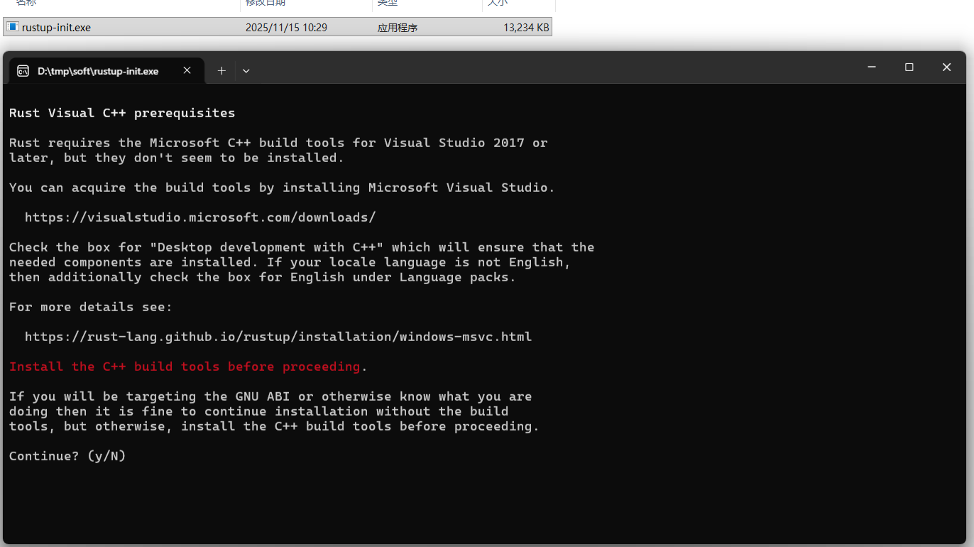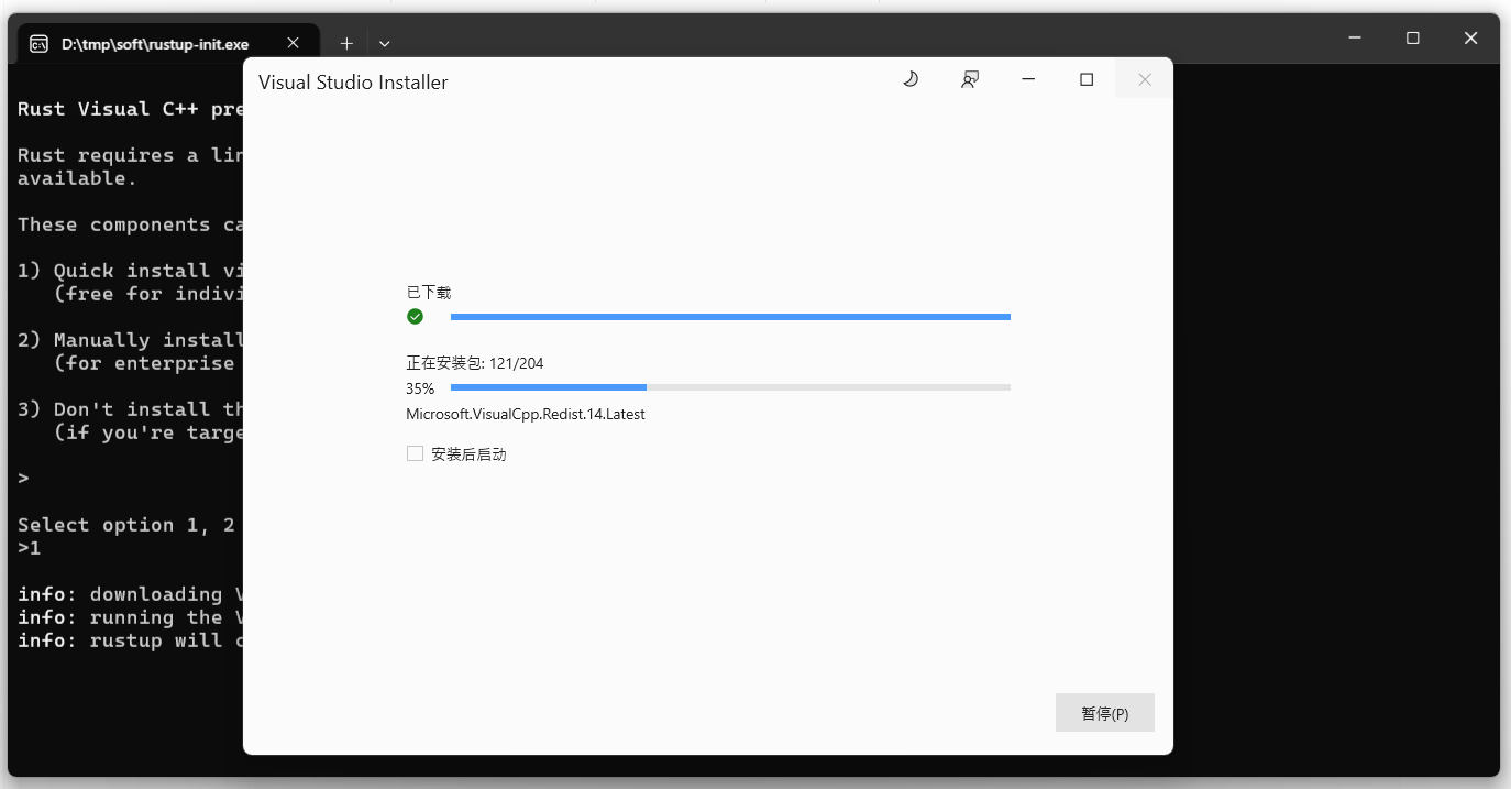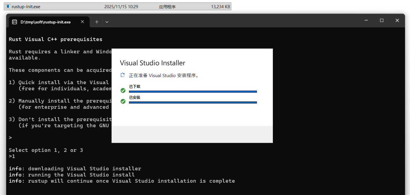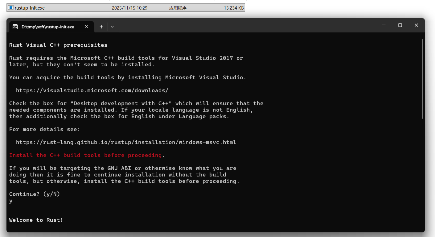 rust 需要 Visual C++ 的环境,如果电脑上没有,会先安装,笔者电脑上没有