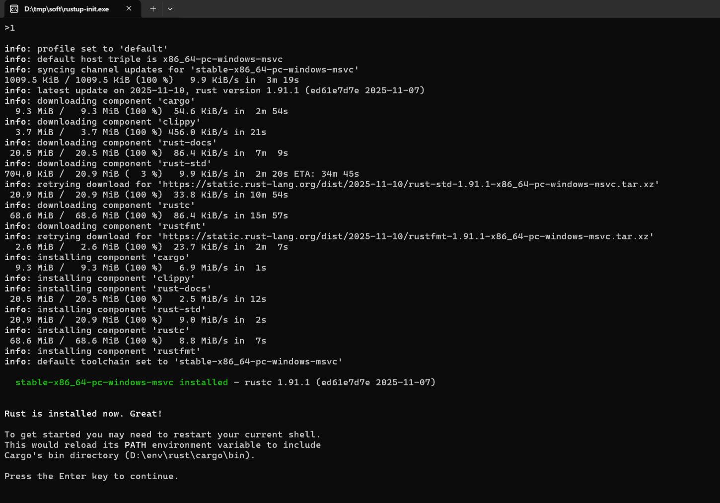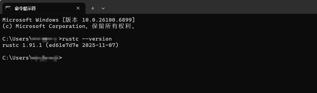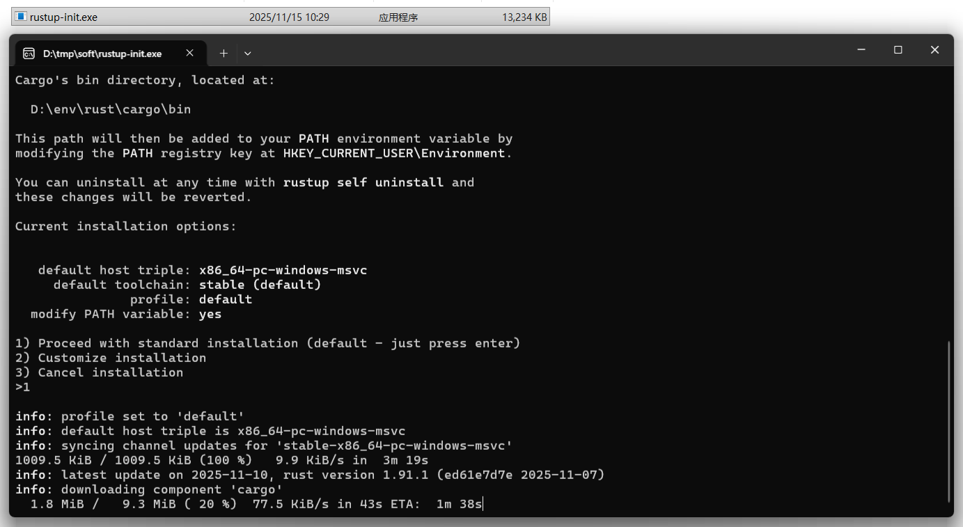 安装完成后,再次点击 rustup-init.exe 进行安装