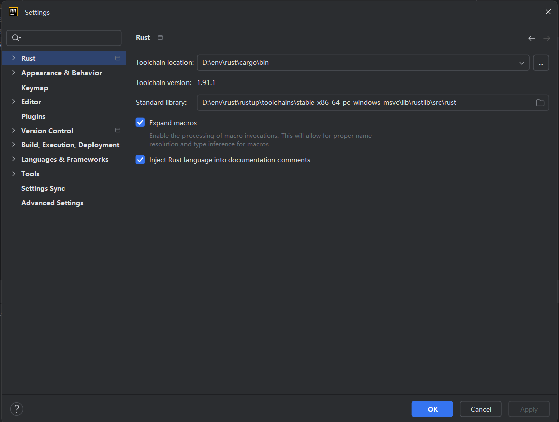 打开后,点击Settings,找到 Rust 选项,会自动识别