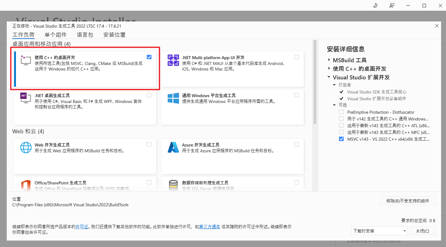 则下载 vs_BuildTools,安装 使用 C++ 的桌面开发