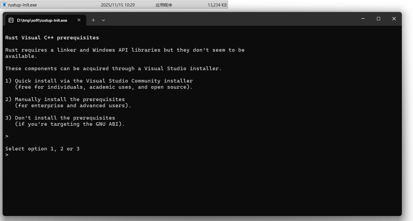 配置完环境变量后,执行 Rust 安装程序,弹出下面窗口