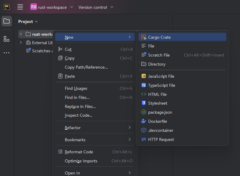 在工作区目录上右键,New Cargo Create 创建项目