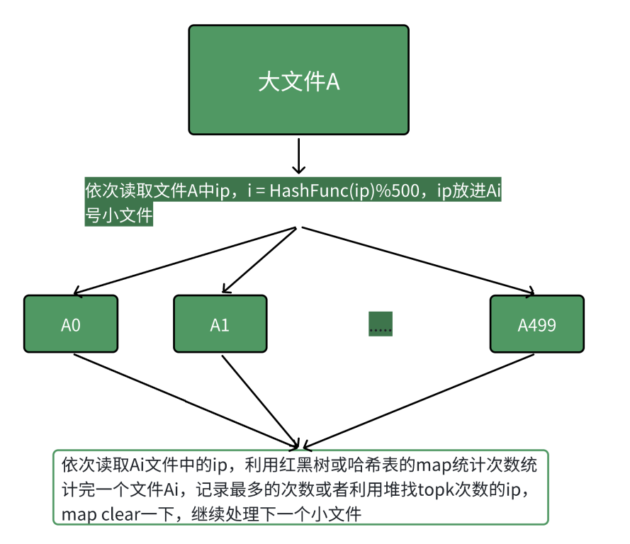 核心原理:相同的IP在哈希切分过程中,一定会进入同一个小文件Ai,不可能出现同一个IP进入Ai和Aj的情况(i≠j),因此对每个Ai文件单独统计IP次数就是准确的全局次数。