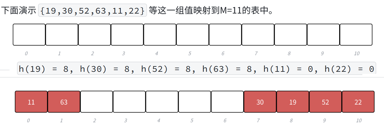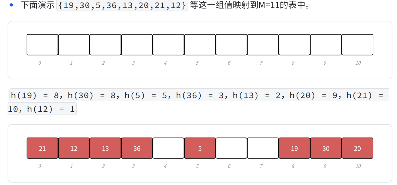 除法散列法也叫做除留余数法,假设哈希表的大小为M,那么通过key除以M的余数作为映射位置的下标,也就是哈希函数为:h(key) = key % M。