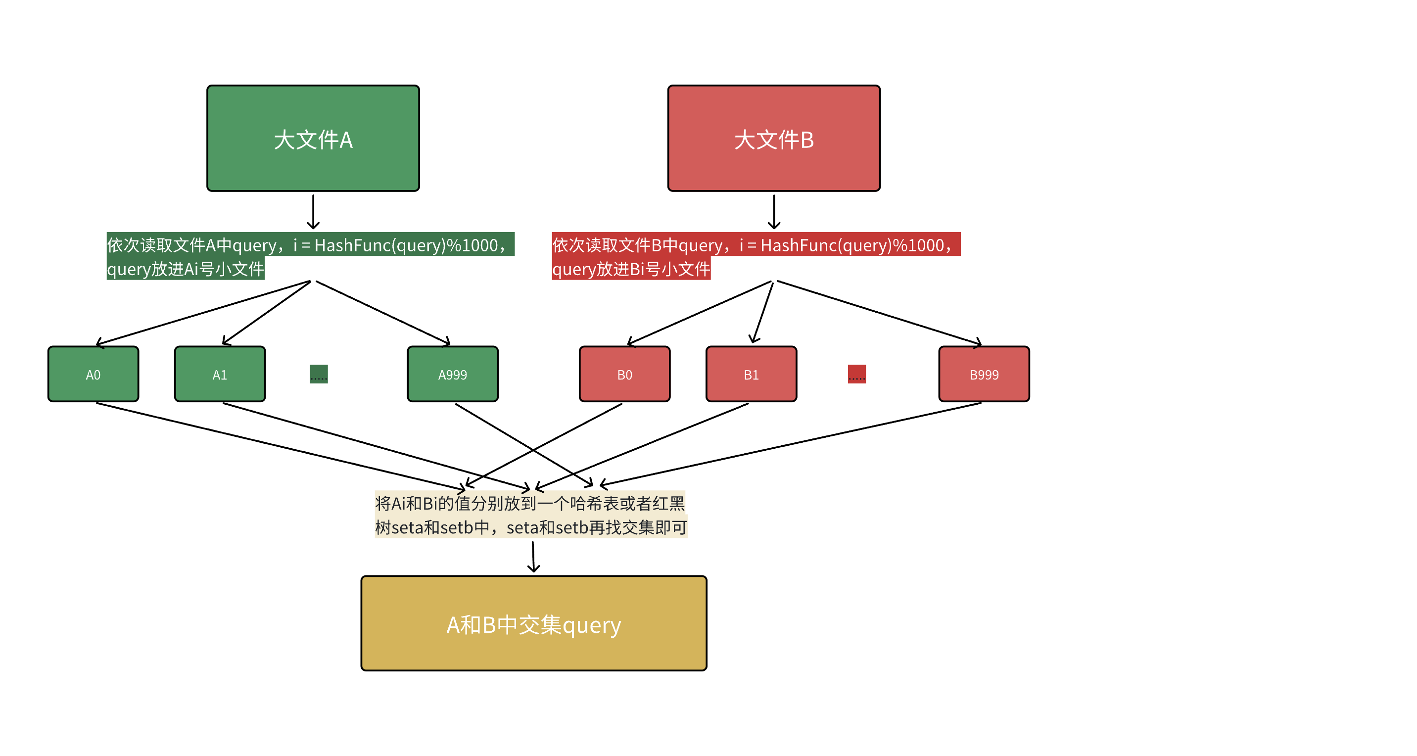 **做法:**利用哈希切割,依次读取文件中query,i = HashFunc(query) % N(N为准备切分多少份小文件,N取决于切成多少份时内存能放下),query放进第i号小文件,这样A和B中相同的query算出的hash值i是一样的,相同的query就进入的编号相同的小文件,然后编号相同的文件直接找交集就行,不用交叉找,效率就提升了。