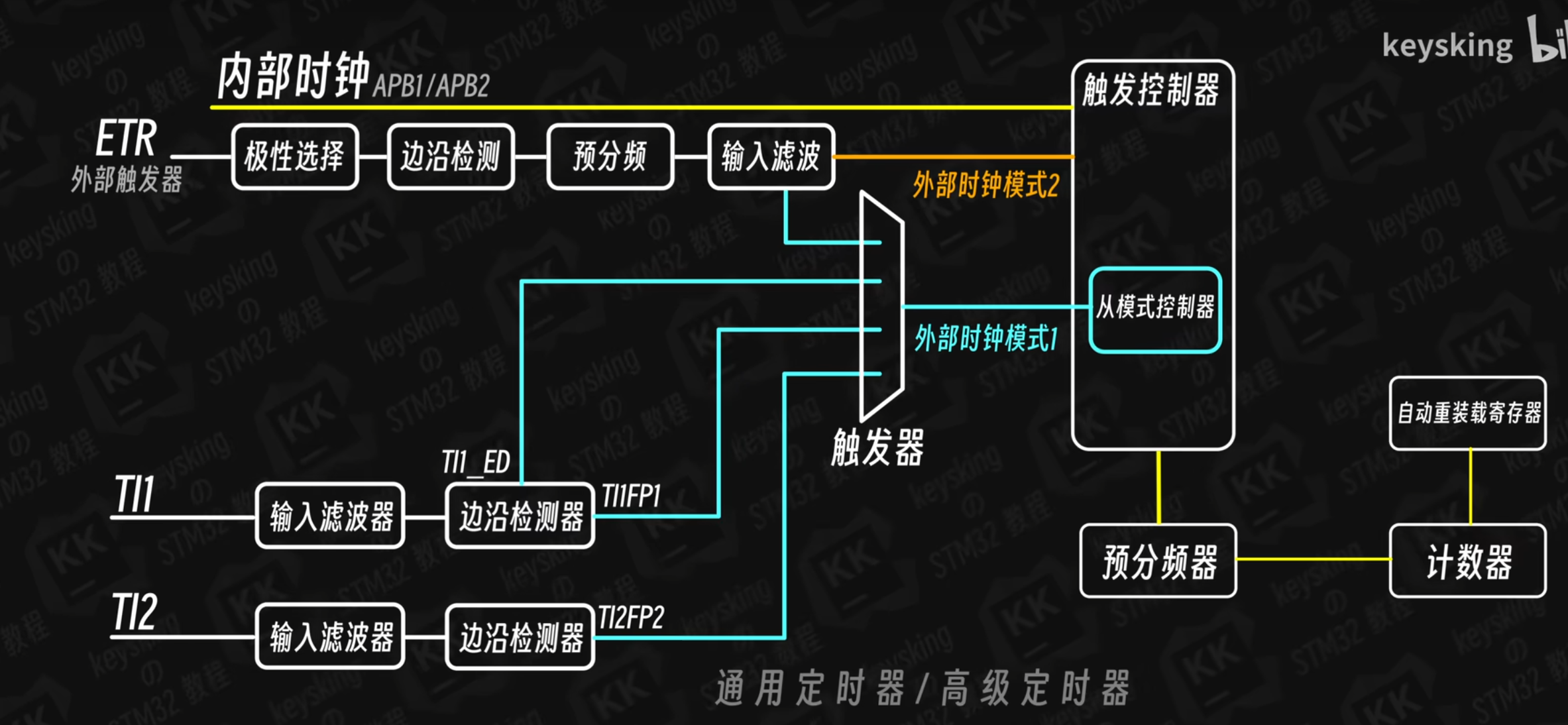 外部时钟模式1:顾名思义,当从模式选择外部时钟源模式1,此时从模式的信号源会成为定时器的时钟源