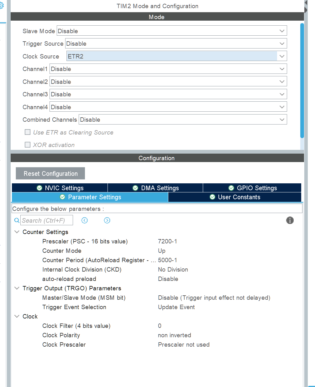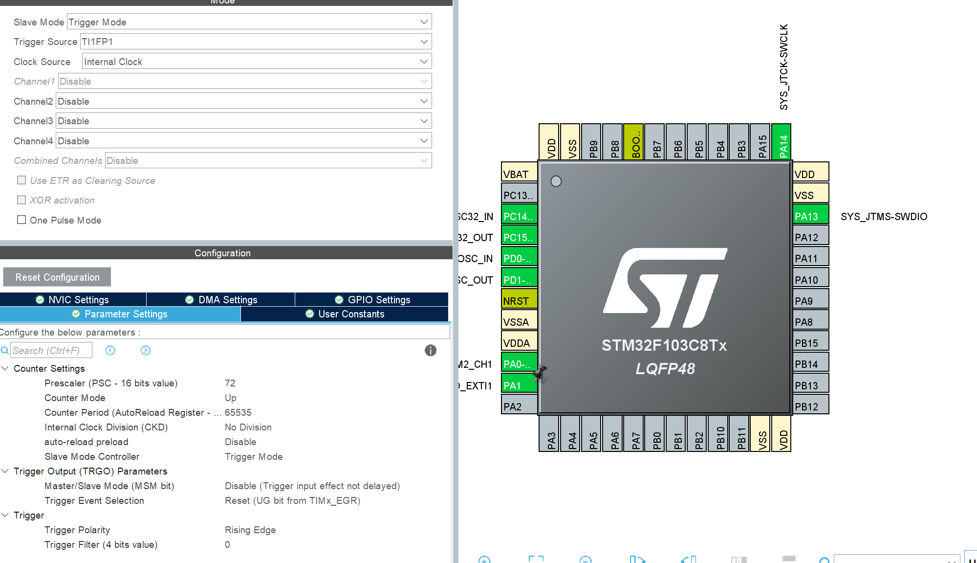 触发模式: 当从模式选择触发模式,当检测到信号源传进来的是设定的电平 后定时器开始工作,但是触发模式只能启动定时器不能停止定时器,这个模式经常和定时器的单脉冲模式(One Pulse Mode) 配合,单脉冲模式就是定时器不再循环计数,当计数器计到自动重装器的值后不再计数,计数器归零