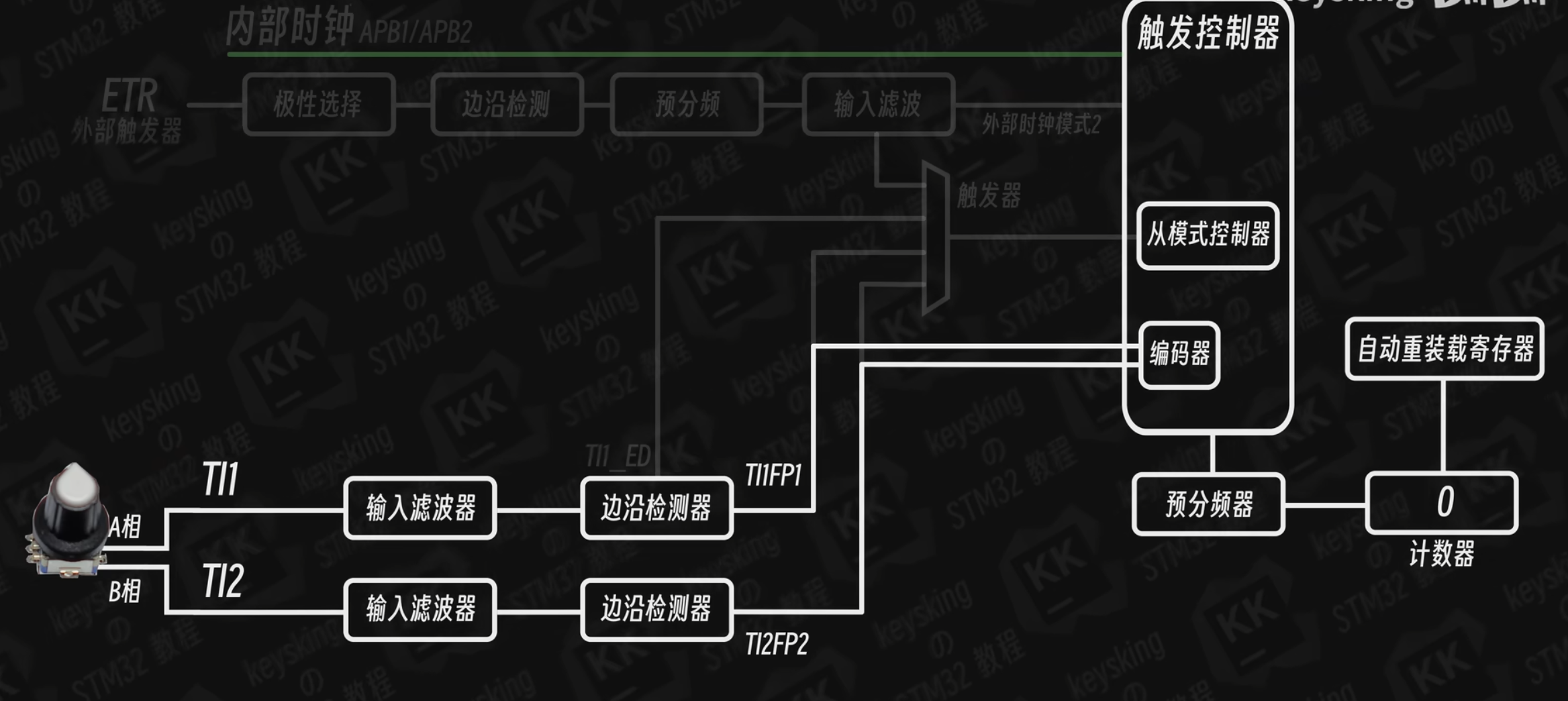 外部时钟模式2:当要选择这个模式就要将定时器的时钟源选择,选择成ETR,这样定时器的时钟源就来设定好的引脚,自每个定时器都有规定的ETR引脚,ETR模式只能检测上升沿,要检测下降沿要和极性选择配合,极性选择可以将上升沿和下降沿身份互换 ,ETR这条通道除了可以从外部时钟中配置还可以从从模式中配置