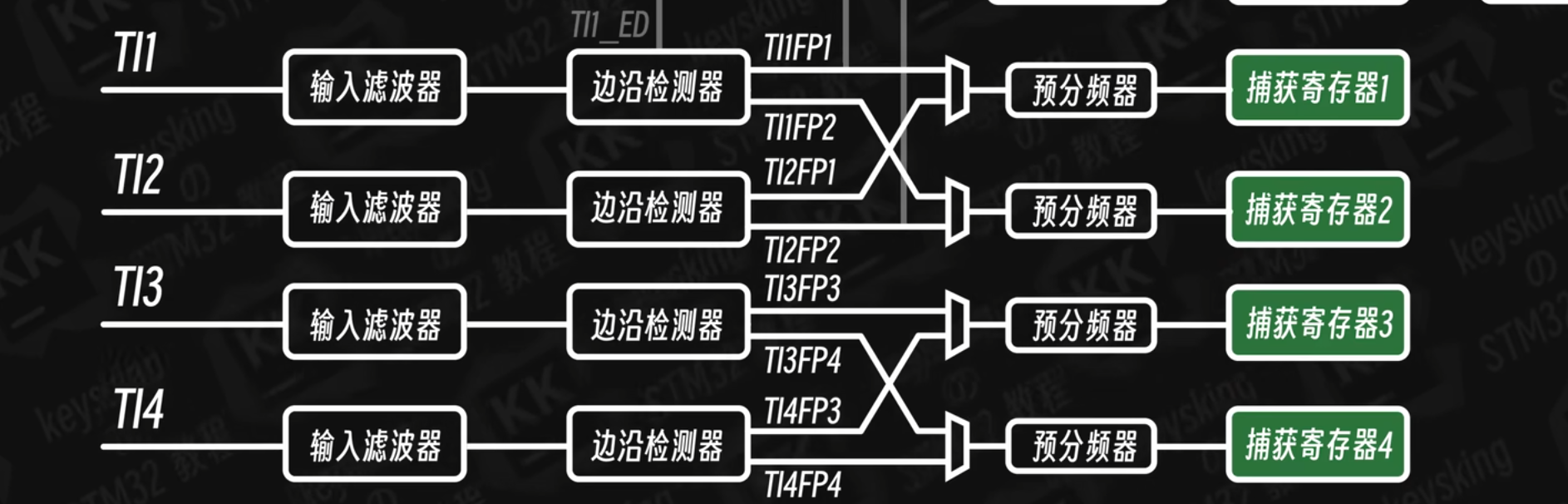 四个通道的关系:TI1,TI2的TI1FP1和TL2FP2信号可以传入外部时钟模式1,进行更多操作