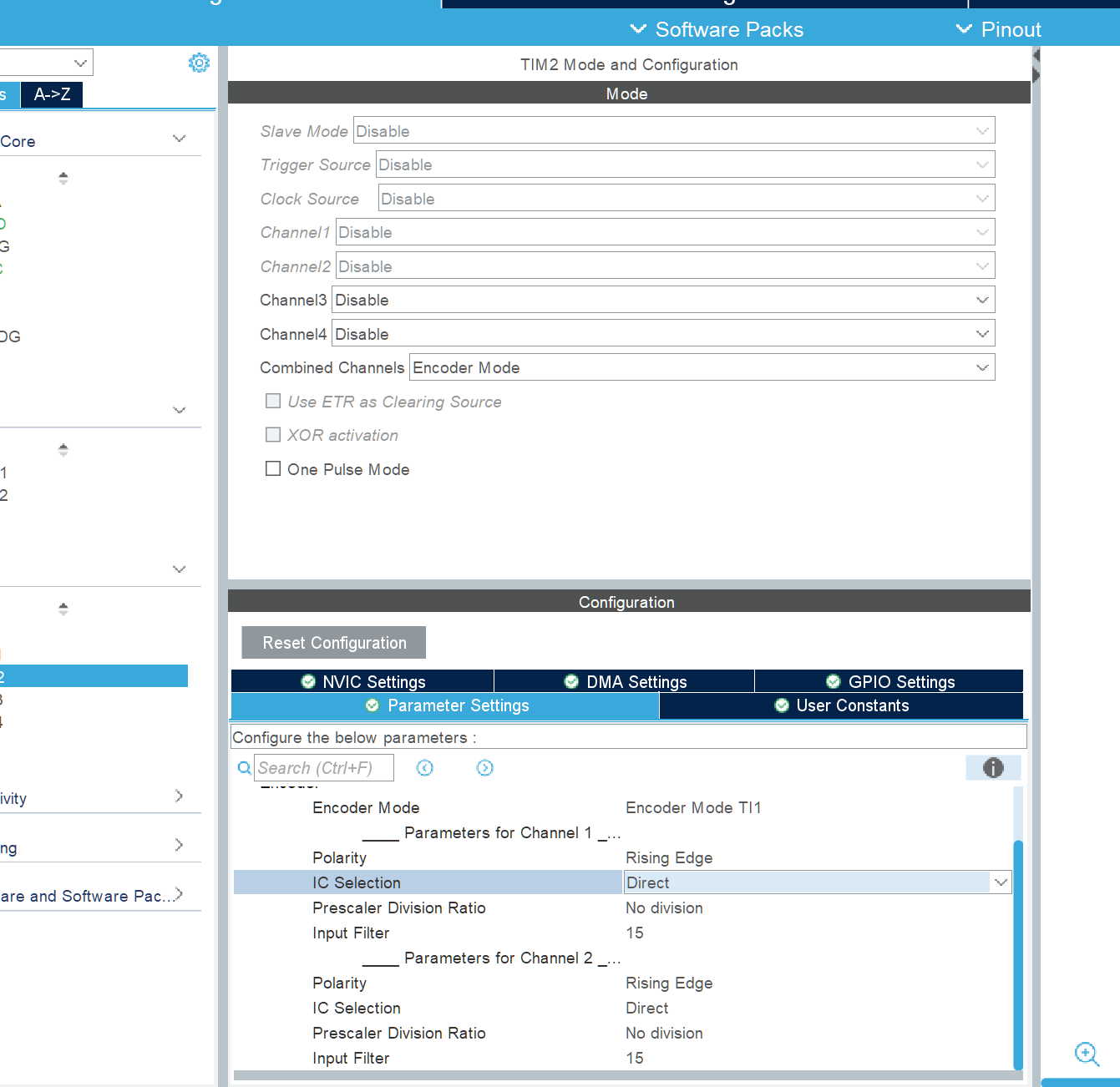 用定时器计算编码器:单片机已经设置好了,把定时器的TI1FP1和TI2FP2设置成编码器的A相和B相,
