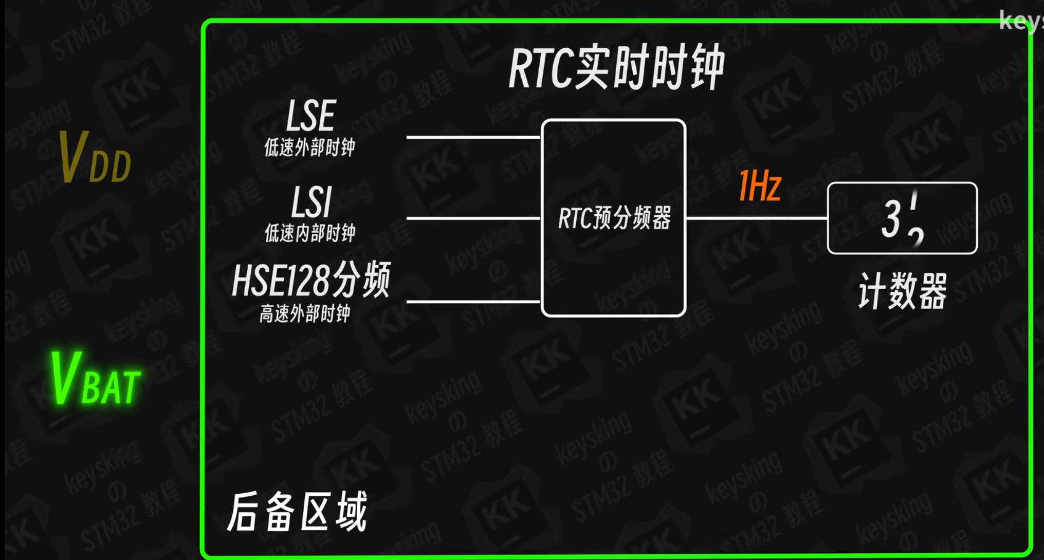 RTC的计数器是32位的,RTC计数器还有一个分频器,他会自动将频率设置成1hz,当把单片机的断电,只要继续给Vbat引脚供电,RTC时钟就会继续走,