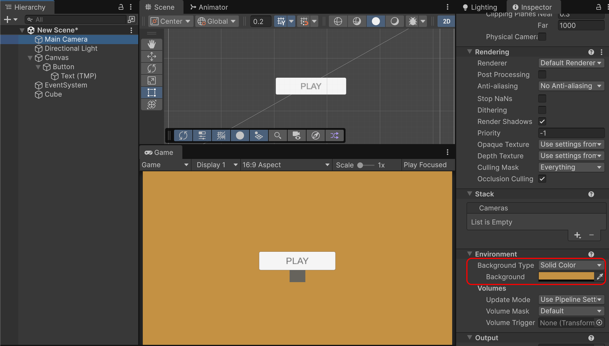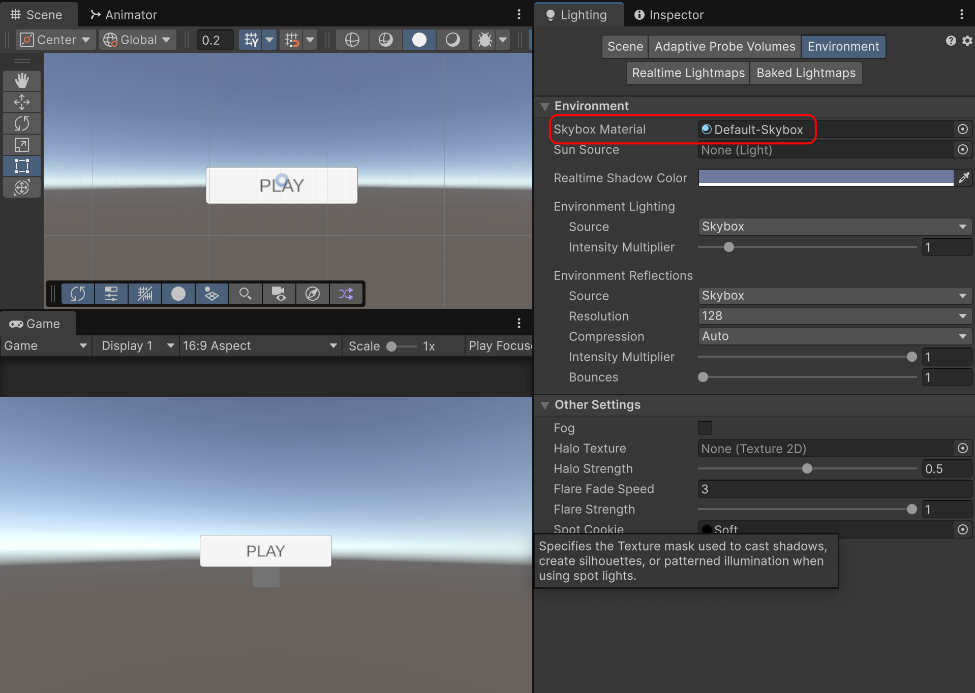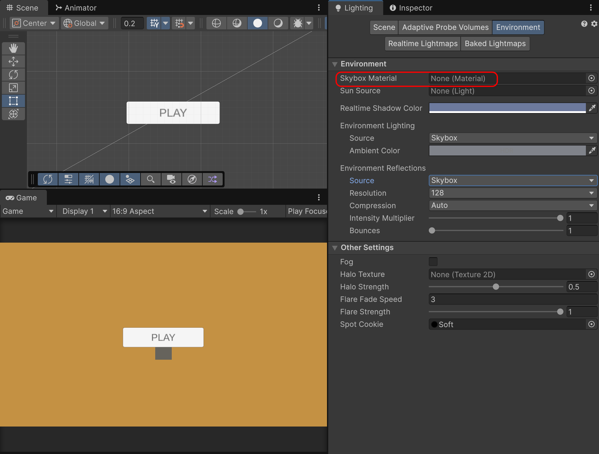 - 如果想将Scene视图的背景设置为纯色,需要打开菜单Window -> Rendering -> Lighting ,将Environment 里的Skybox Material 设置为None 。单纯的设置MainCamera的Background Type 里的Solid Color只能影响Game模式的背景色,而不会对Scene视图的背景产生影响。