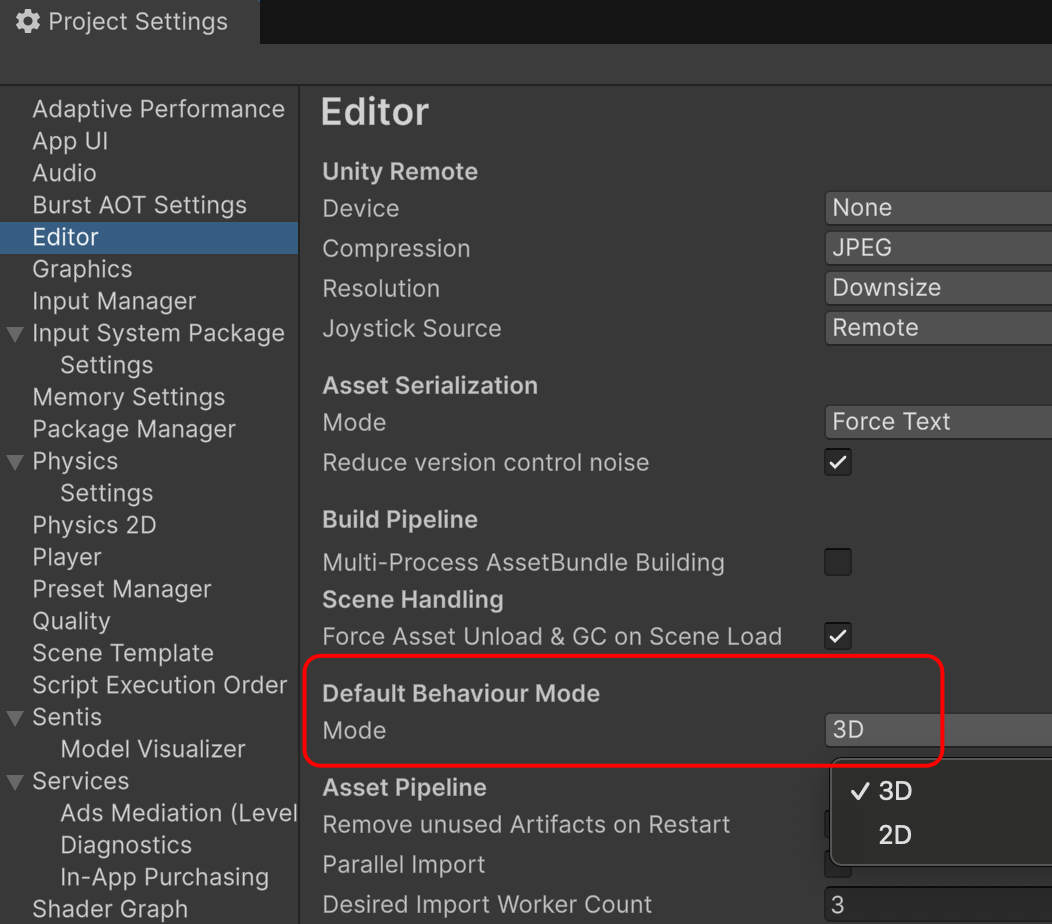 - 在项目的Project Settings, Editor里的Default Behavior Mode,可以选择2D或3D,设置好后再新创建的场景就会是对应的类型了。
