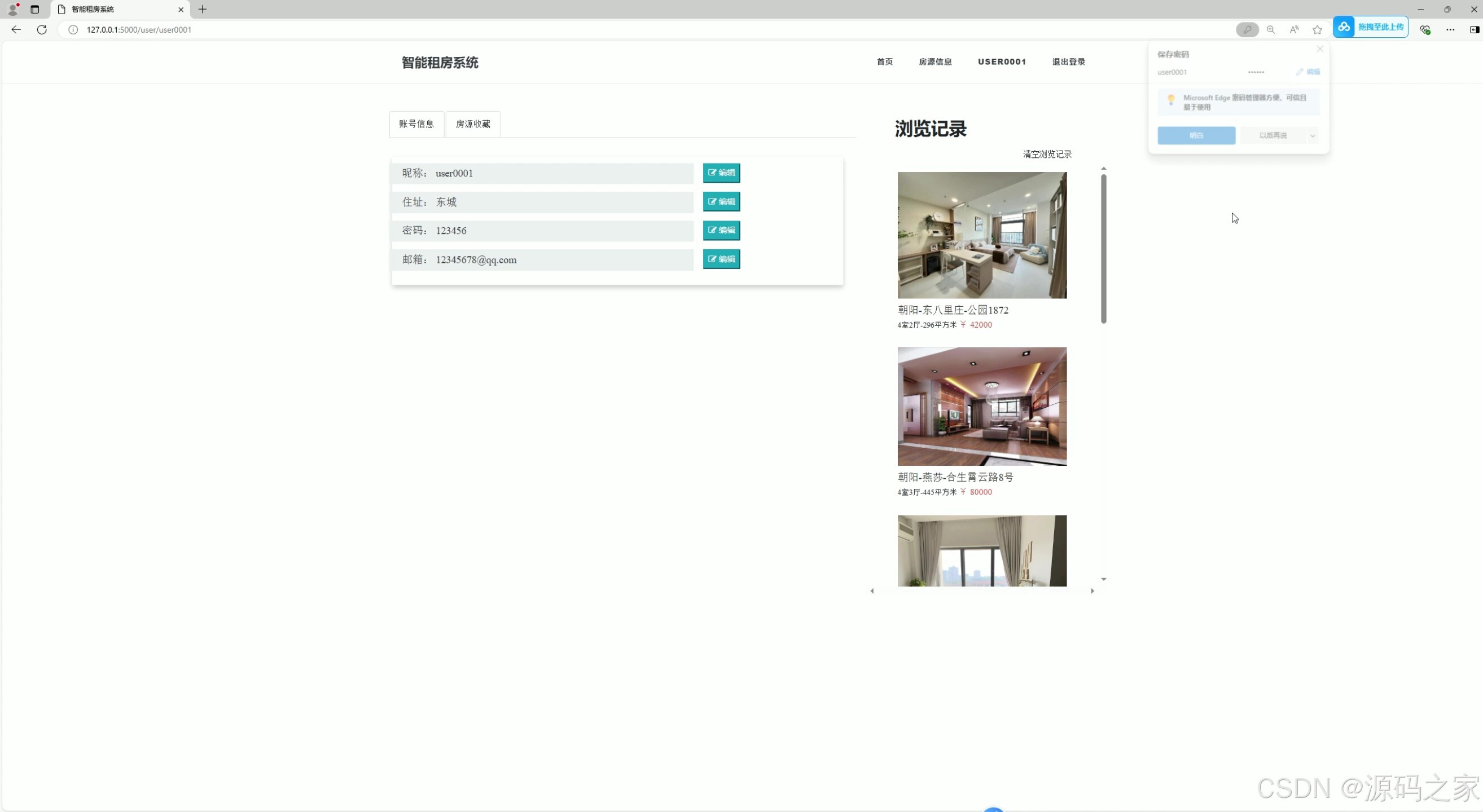 - 功能:用户可以管理个人信息、查看收藏房源、历史浏览记录等。