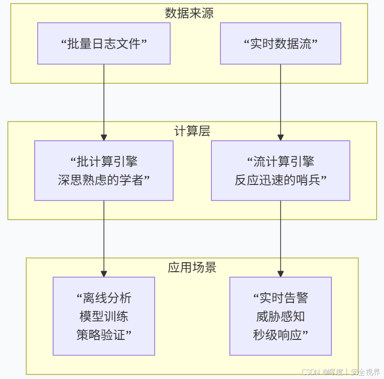 在安全大数据平台的计算层,批计算 与流式计算如同两位特性各异的超级英雄,协同作战,共同应对不同场景下的安全挑战。它们的协同工作模式如下图所示: