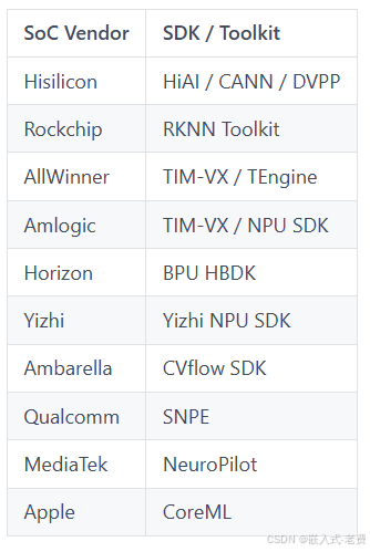 **它的形式就是pytorch-》onnx-》soc npu/cpu/dsp/fpga/gpu。**对于npu,不同厂家有不同的选择,比如有的是外购的ip,有的是自研,有的甚至用dsp实现,这部分就看每家厂家自己的选择了。