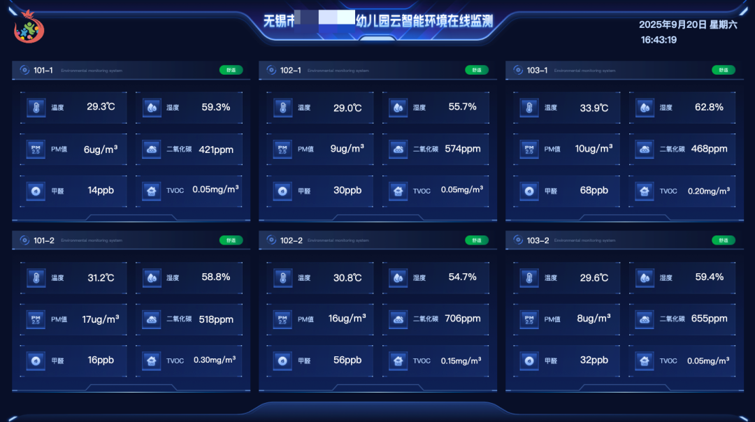定制开发环境监测大屏系统,通过 6 台电视机集中展示 3 层楼所有房间的环境数据。数据实时刷新,传感器上传最新指标后,大屏同步更新,管理人员无需逐间巡查,即可全面掌握全园环境状态。