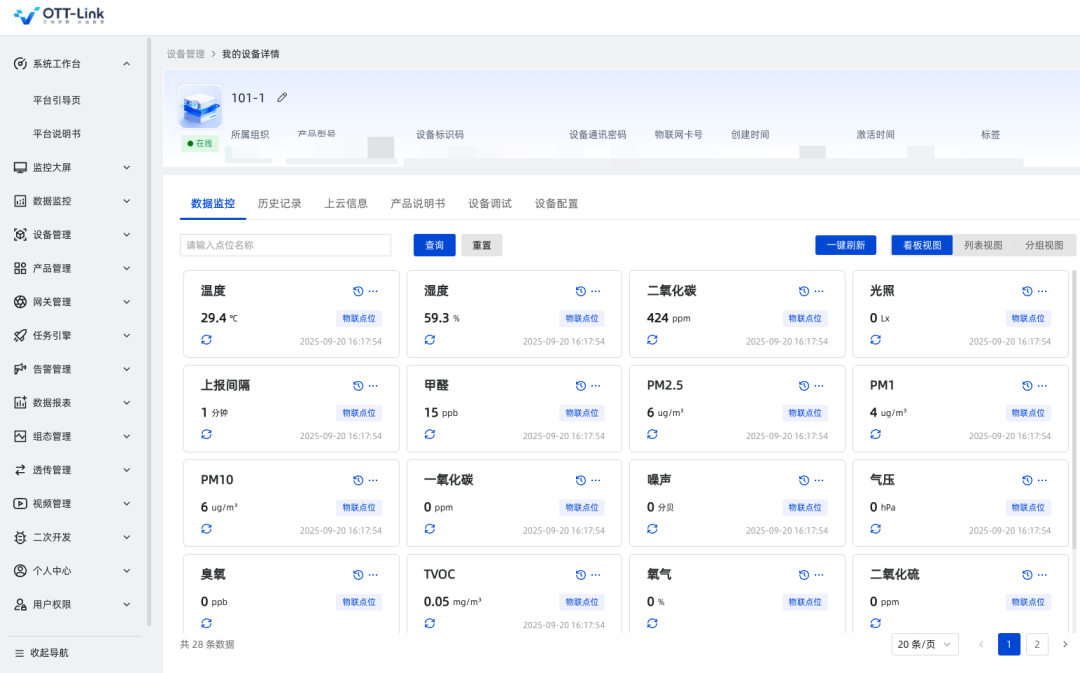 依托 OTT-LINK 行业物联网云平台,实现设备管理、数据存储、解析等核心功能。平台支持历史数据存储与查询,可将原始数据转化为直观的环境指标,同时允许后台灵活修改设备名称,大屏显示同步更新,满足园方个性化管理需求。