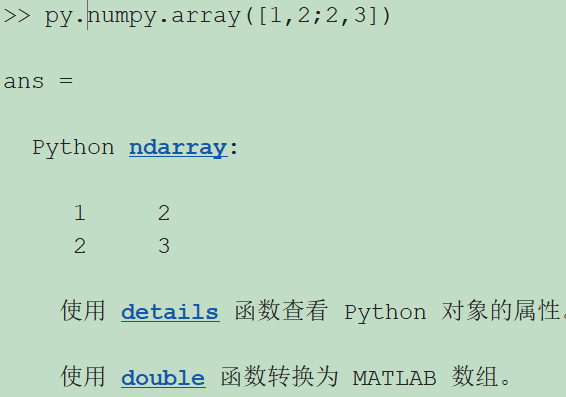 使用py.module_name语法来引入Python模块。module_name是你要调用的Python模块的名称。比如我这里调用numpy包,将[1,2;2,3]的2*2矩阵转换为了python ndarray对象。