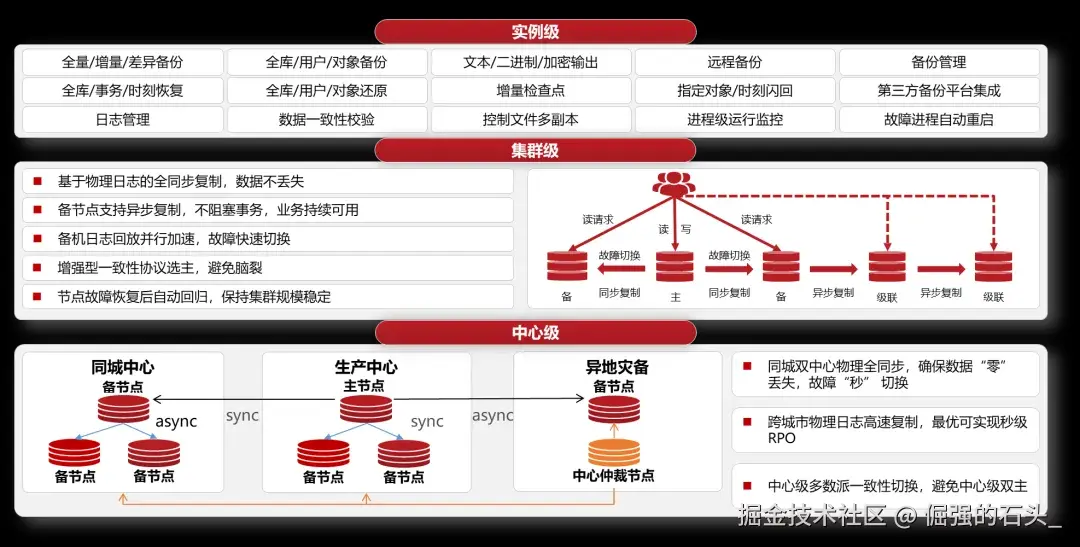 - 数据得保密,权限得分开:从数据传输到存储,都能加密。支持DBA、安全员、审计员"三权分立"的管理模式。权限控制能做到很细的粒度,还能对敏感数据(比如身份证号)做动态脱敏,给不同的人看不同的结果。