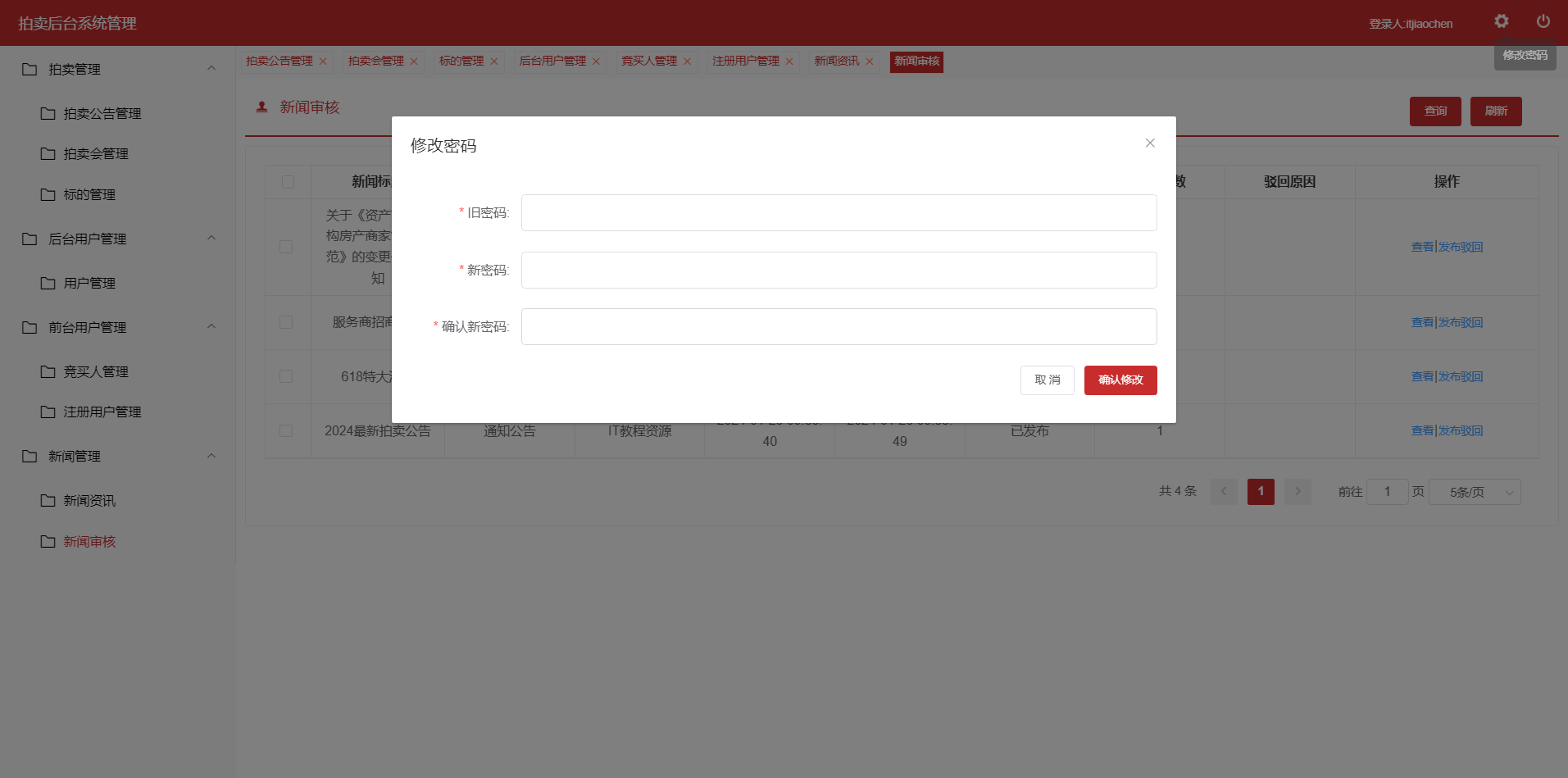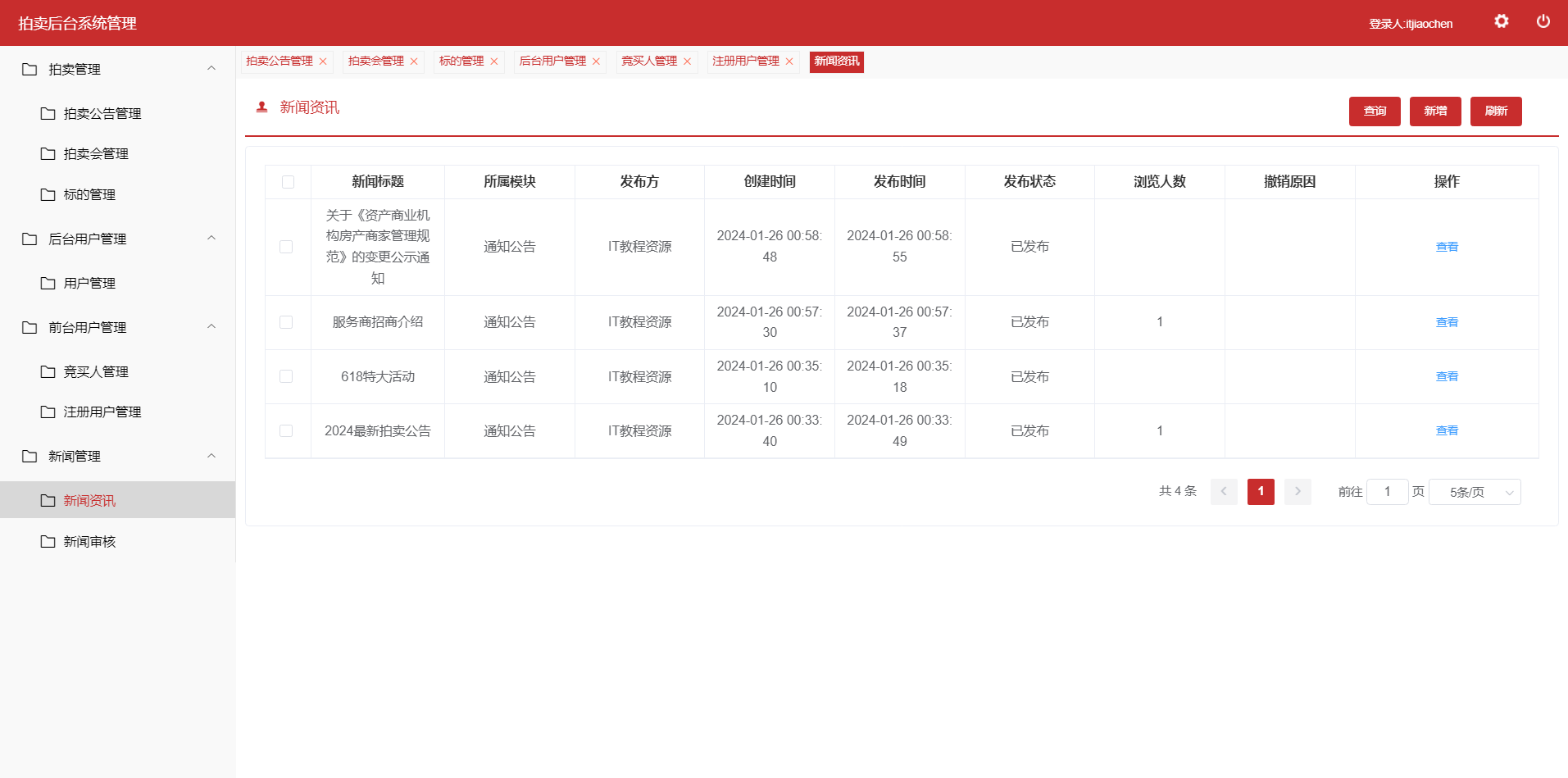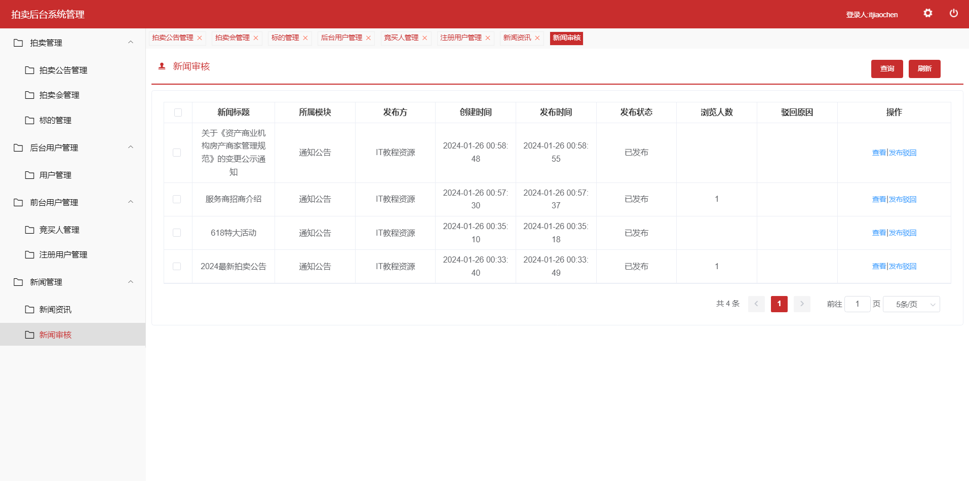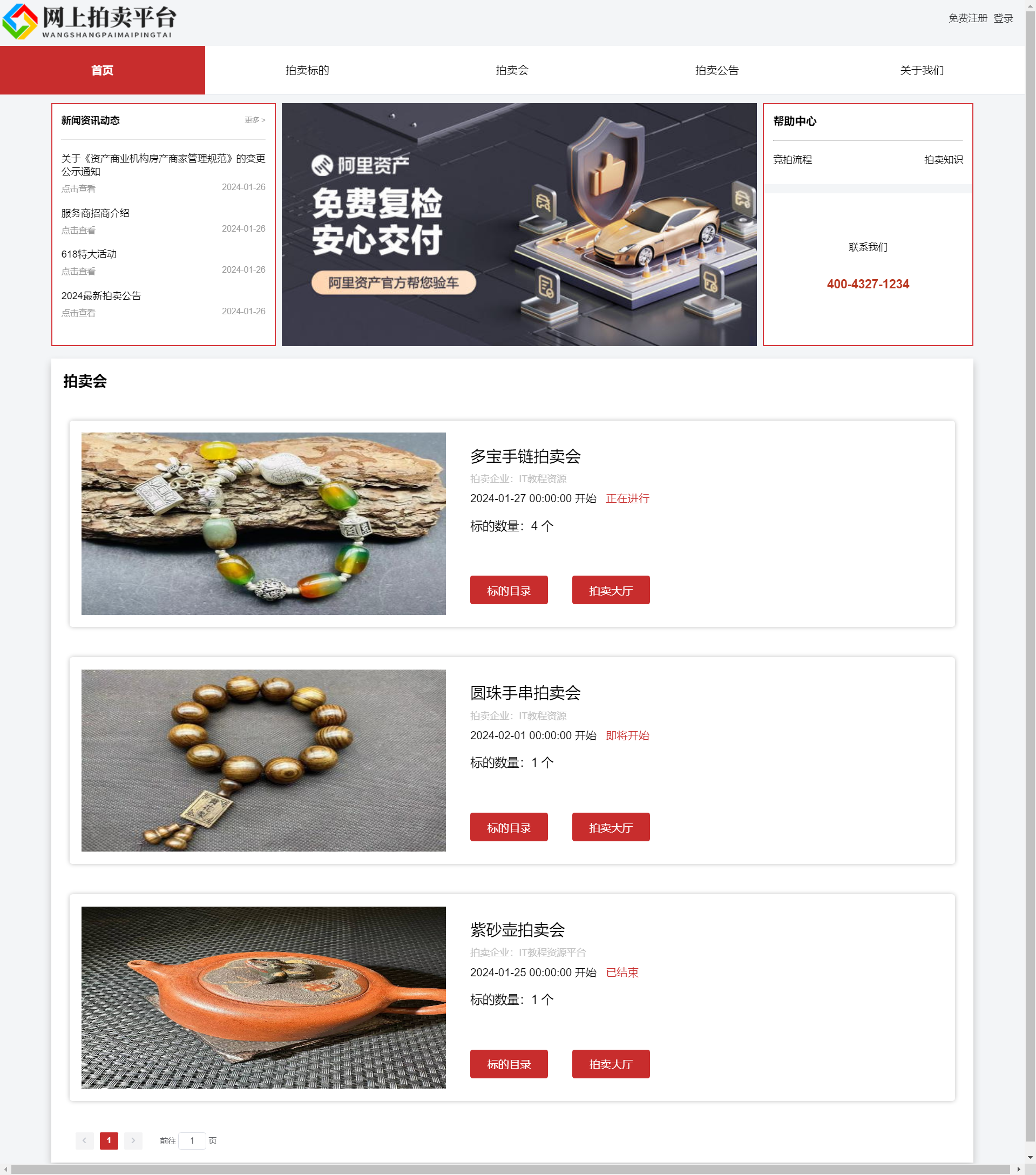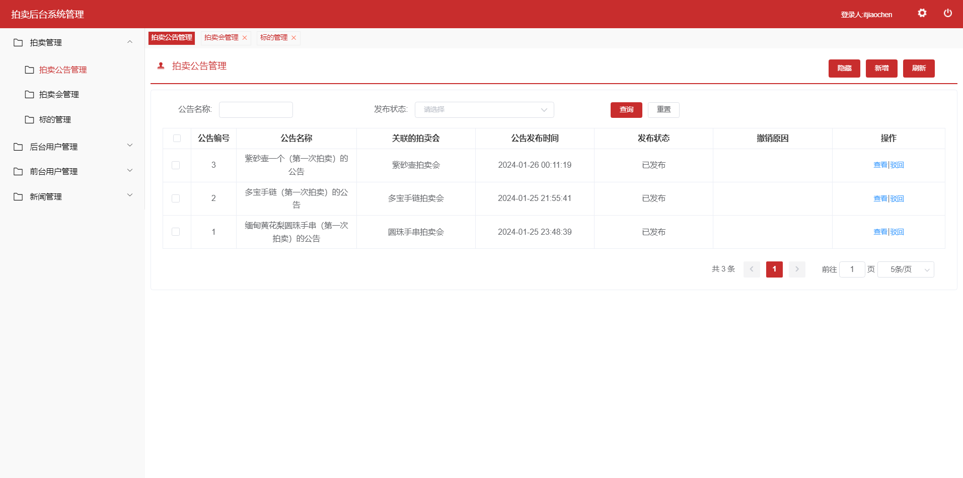 (1).拍卖公告管理:新增、修改、删除、查询、发布、驳回、关联拍卖会