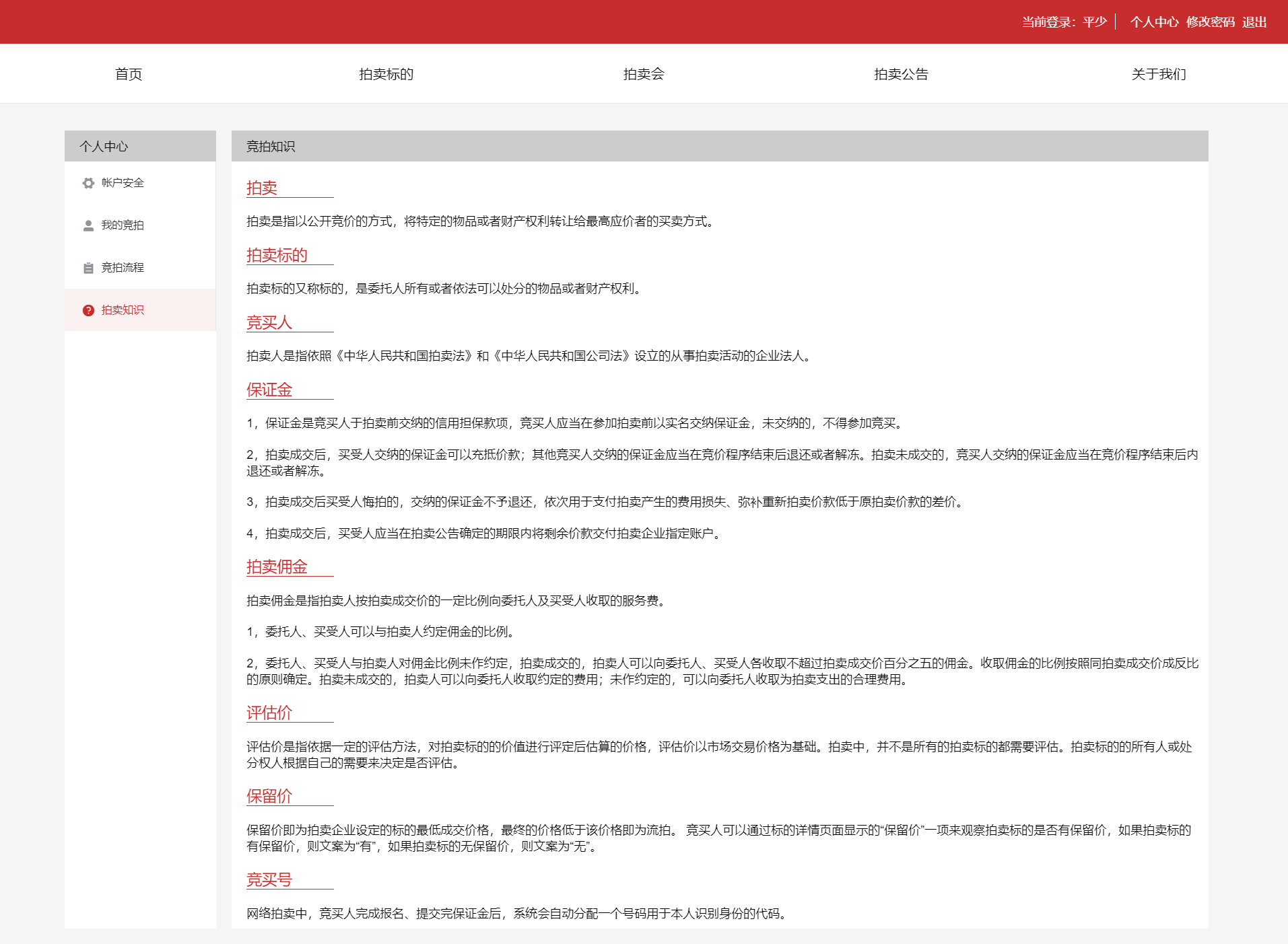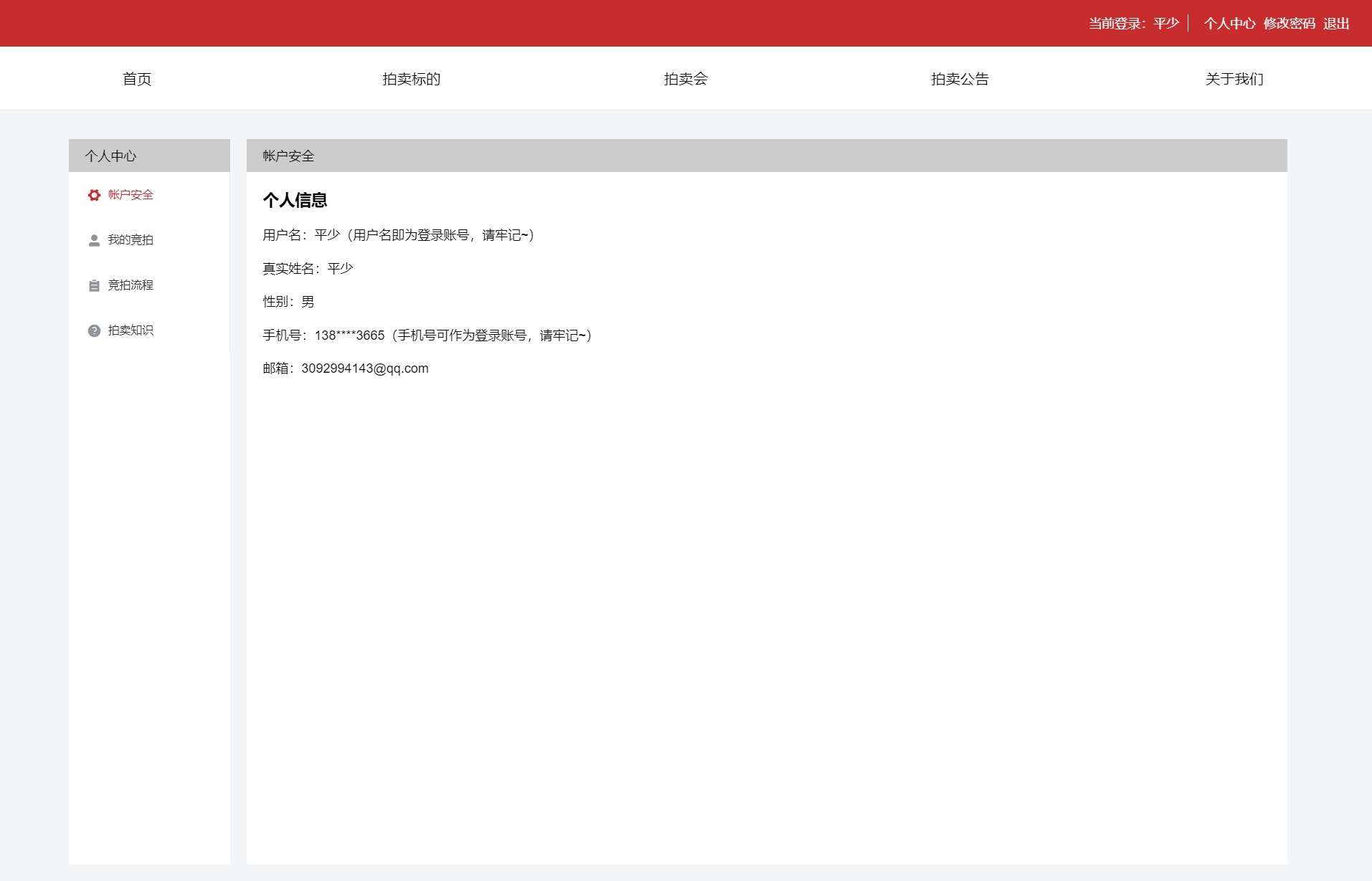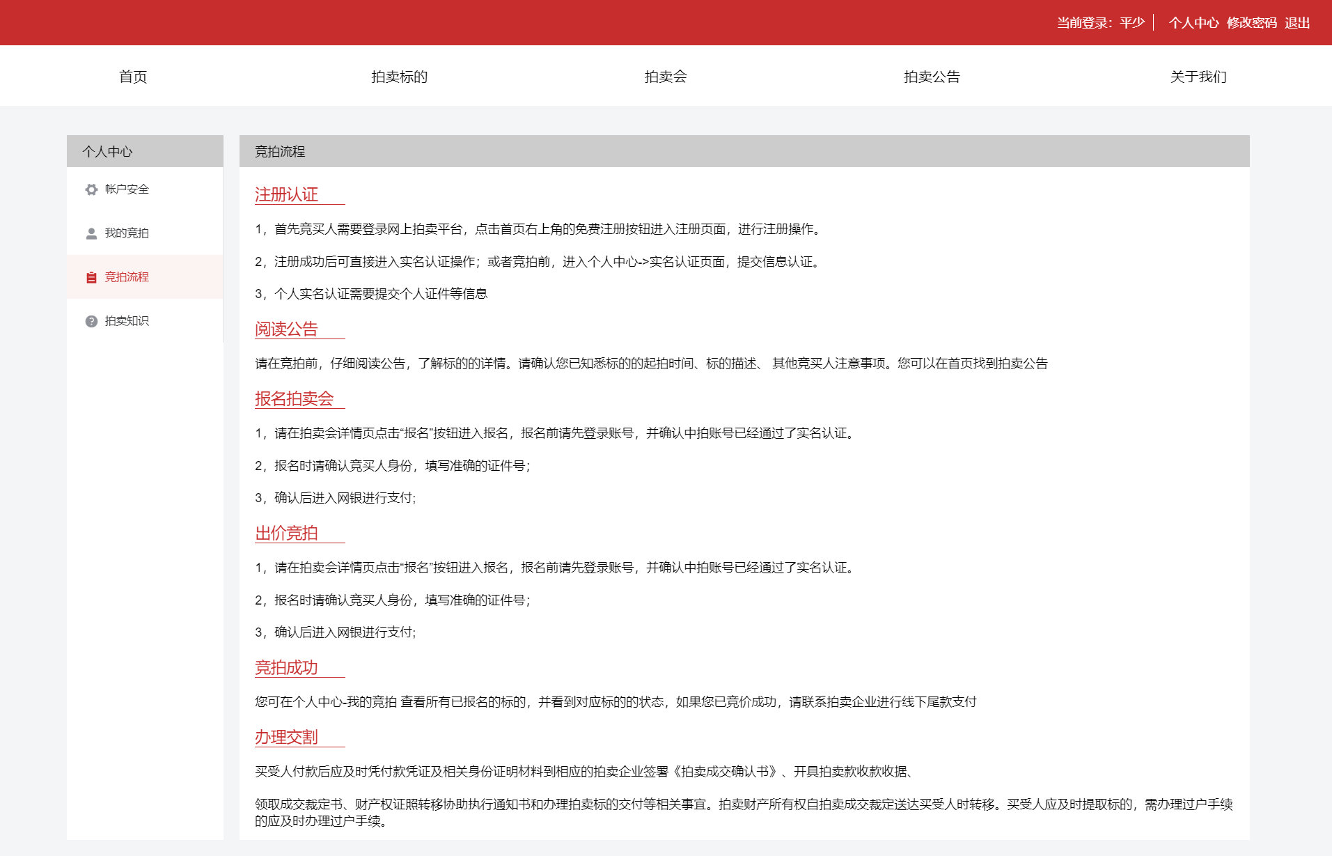 个人中心(账户安全、我的竞拍包括已报名和已拍下、竞拍流程、拍卖知识)、实名认证、修改密码、退出登录