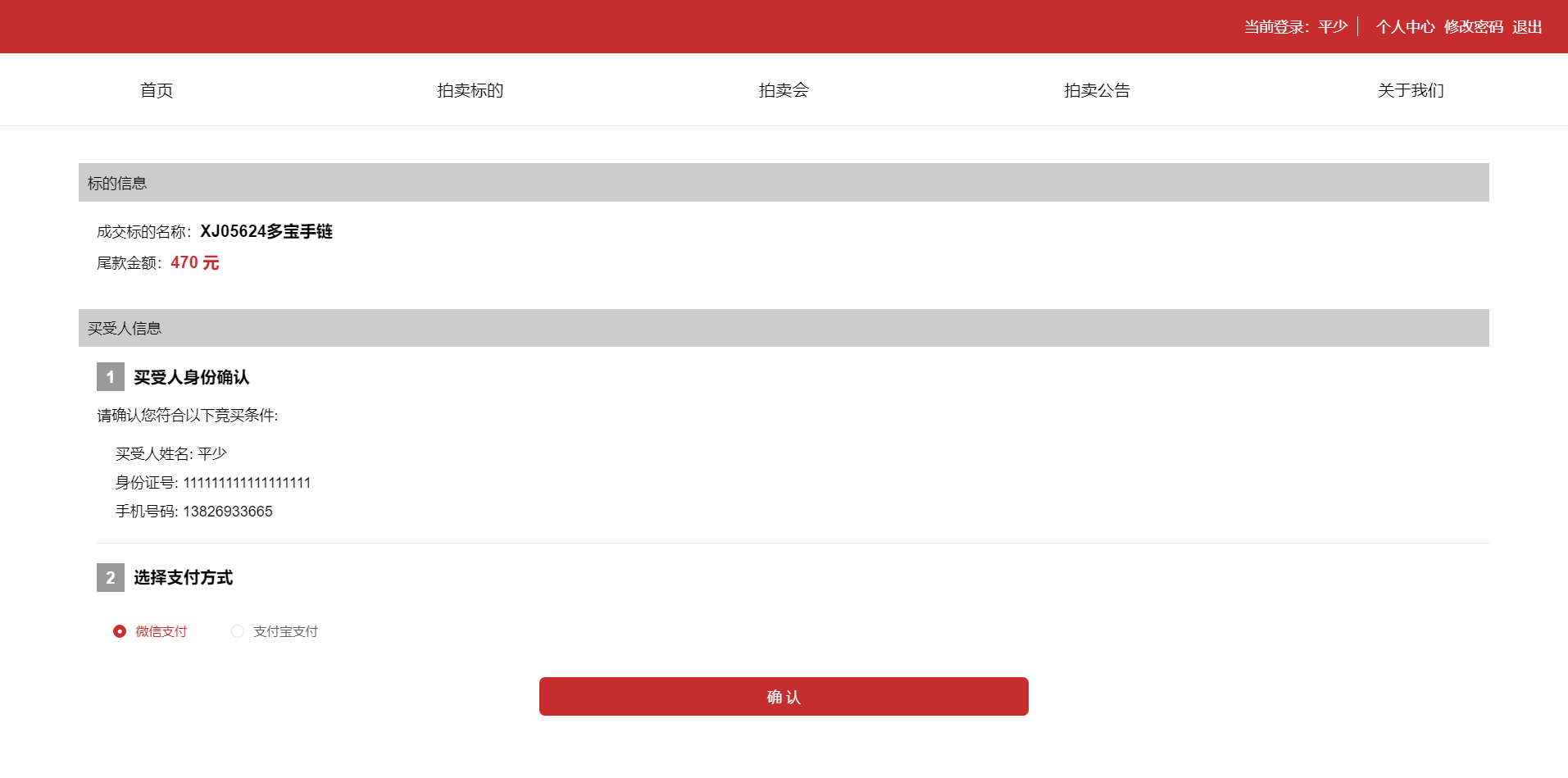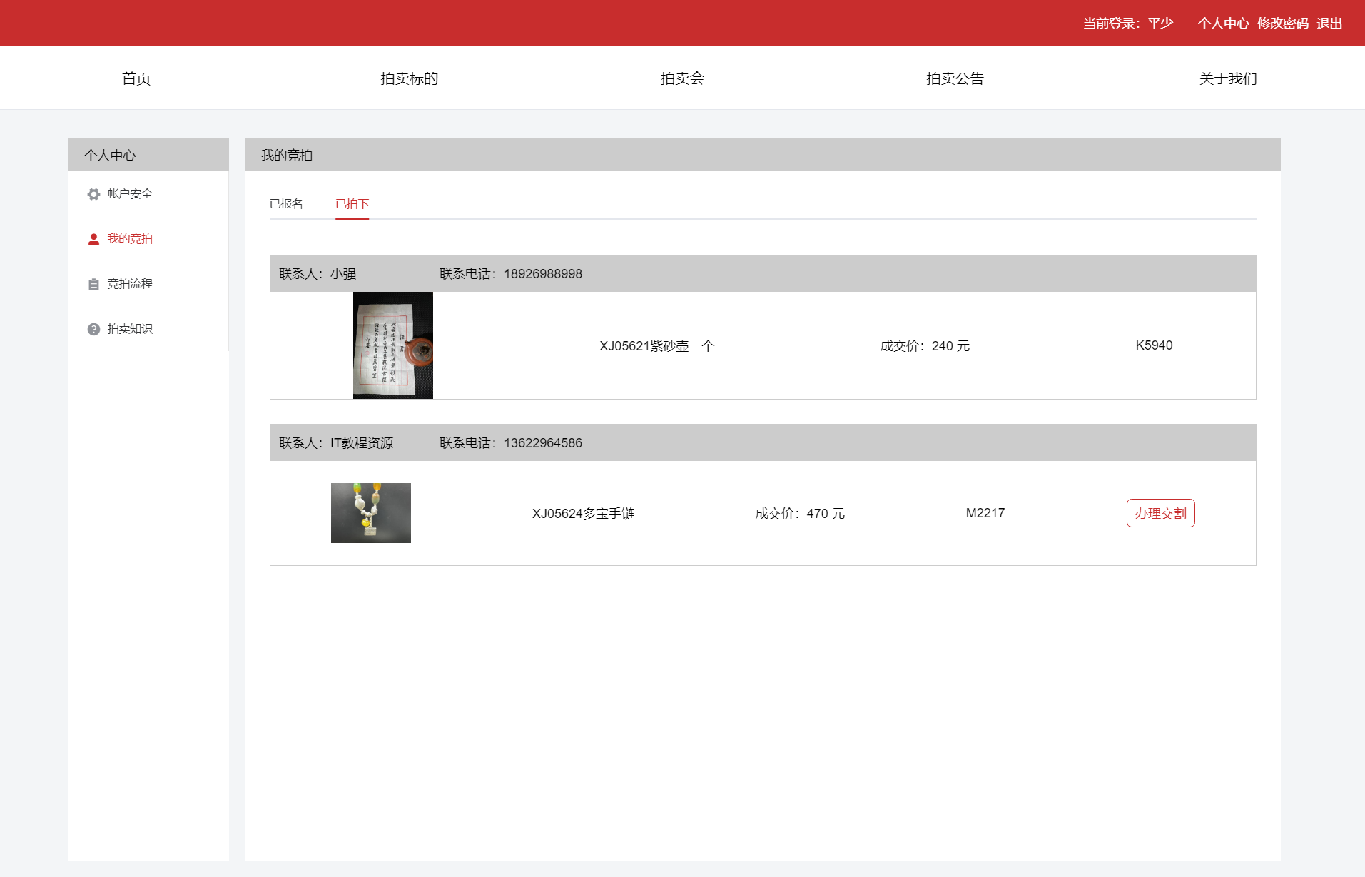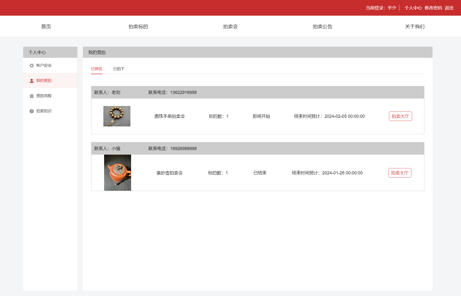 个人中心(账户安全、我的竞拍包括已报名和已拍下、竞拍流程、拍卖知识)、实名认证、修改密码、退出登录