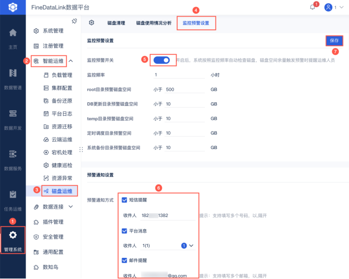 FineDataLink就具备这种健全的监控体系,你看,你直接在管理系统的磁盘运维上就能设置监控预警条件,一旦触发预警条件,系统就会立刻开启预警,并通过短信、平台或邮箱的形式发出警告。