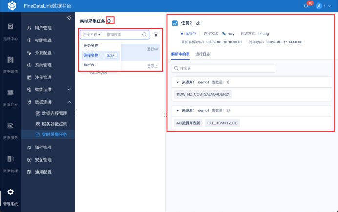 就比如你在FineDataLink的实时采集任务上设置条件,就能在右边的任务栏中实时看到运行状态。