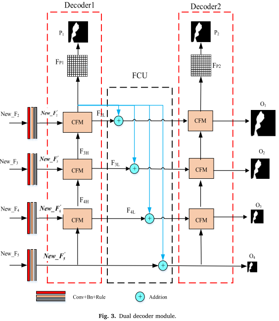 FiL = FiL + Up(Fp1) // 将第一解码器的预测融入第二解码器