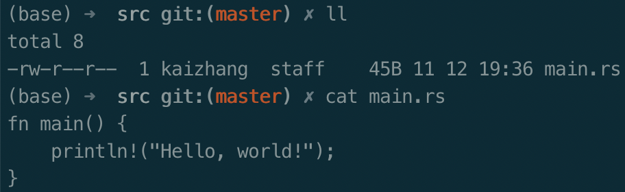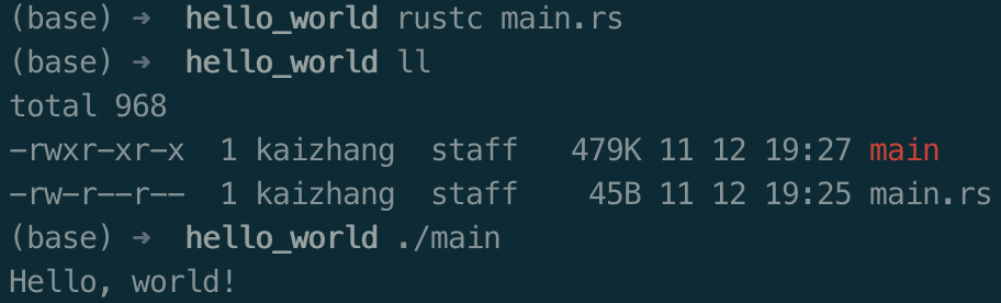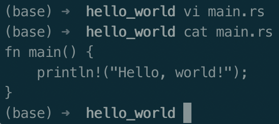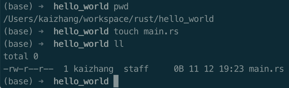 输入下面命令,在指定路径下创建rust目录,新建一个hello_world项目目录,再创建一个main.rs文件,